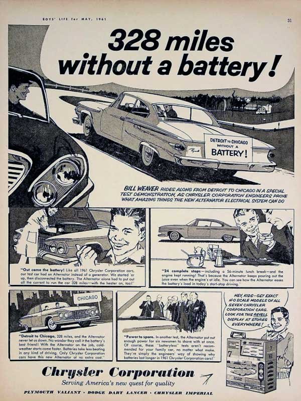 So convinced were the Chrysler executives in the promise of the alternator that they approved a 328-mile drive from Detroit to Chicago with a pair of Chrysler Corporation vehicles without batteries. A comic-strip article in Boys’ Life magazine, May 1961, described the entire event process. Additionally, Revell revealed an opportunity for readers to purchase all seven Chrysler vehicles in 1/25th scale plastic.