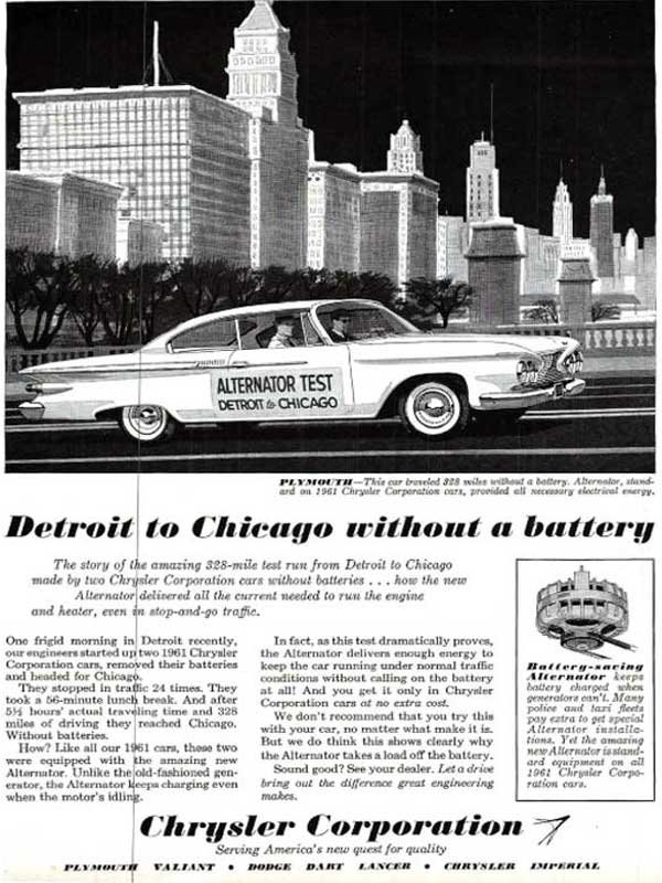 In 1960, the alternator (alternating current generator or AC generator) became a standard option on the Plymouth Valiant. Before alternators, cars used DC (direct current) generators (dynamos), which were less efficient, especially at low speeds.