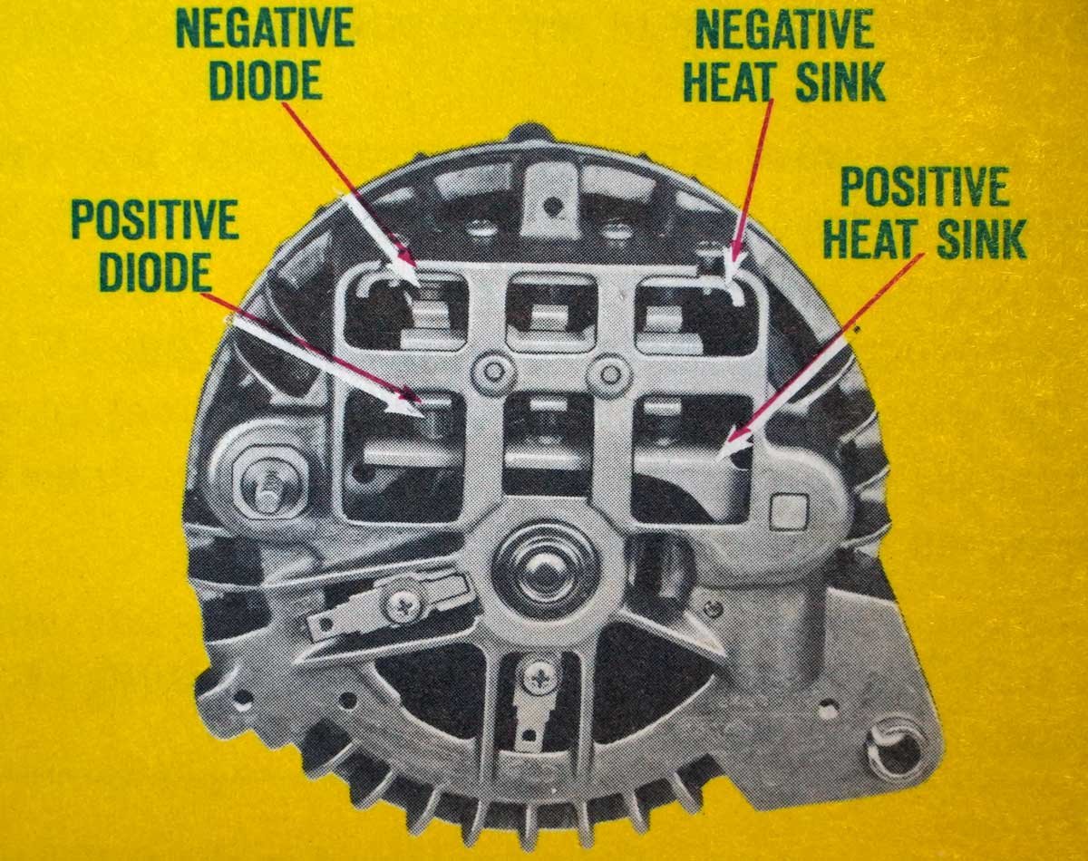 Of the six diodes, three are negative diodes press-fitted into the alternator’s rear framework. The three positive diodes are pressed into an independent framework affixed to the rear frame connected to the B+ battery stud. A paper-thin mica insulator keeps the two electrically isolated.
