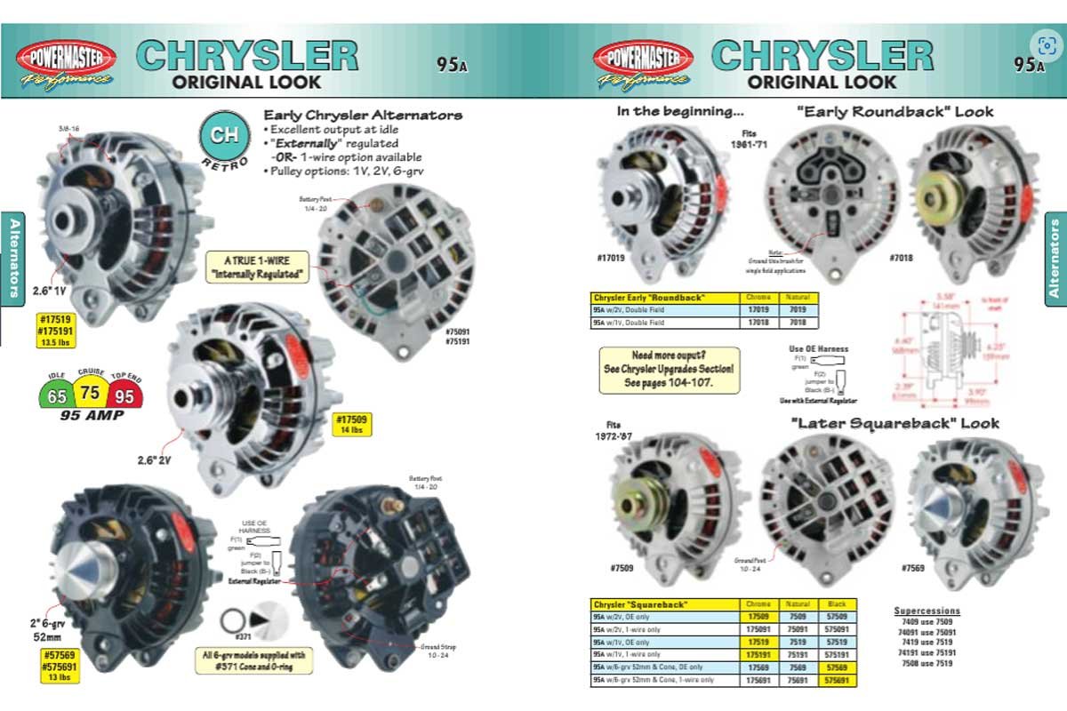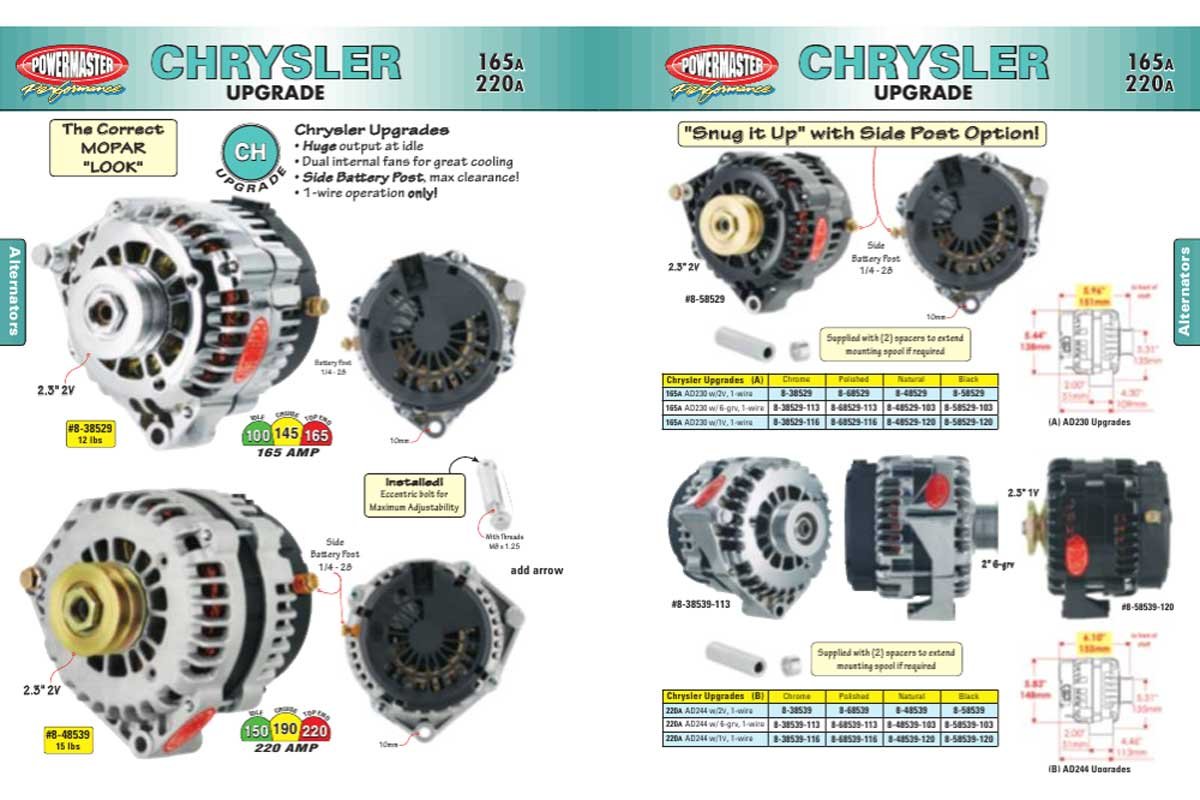 Above Left: Powermaster offers 95-amp original-look alternators in round and square back designs (catalog pages 102-103). Above Right: If high output amperage is desired, Powermaster steps up the amperage to as much as 200 amps (catalog pages 104-105).