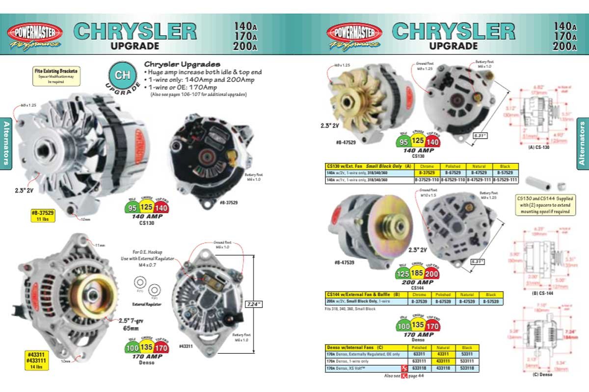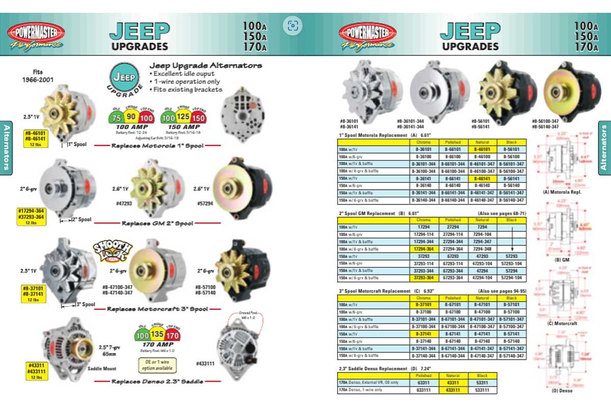 Above Left: Powermaster’s late-model alternators kick the amperage up to 220 amps (catalog pages 106-107). Above Right: Powermaster did not forget the AMC/Jeep owners. It has an array of alternators with up to 170 amps that fit several AMC/Jeep models and years (catalog pages 108-109).