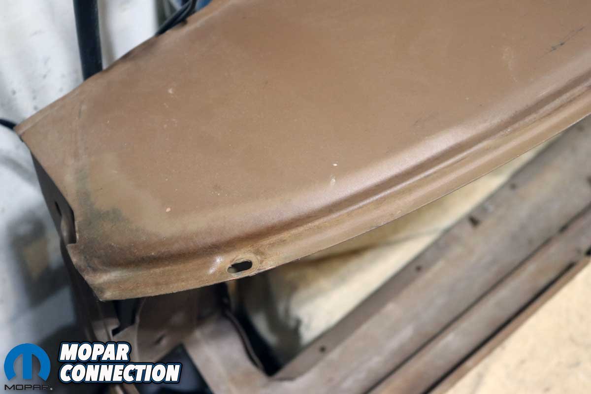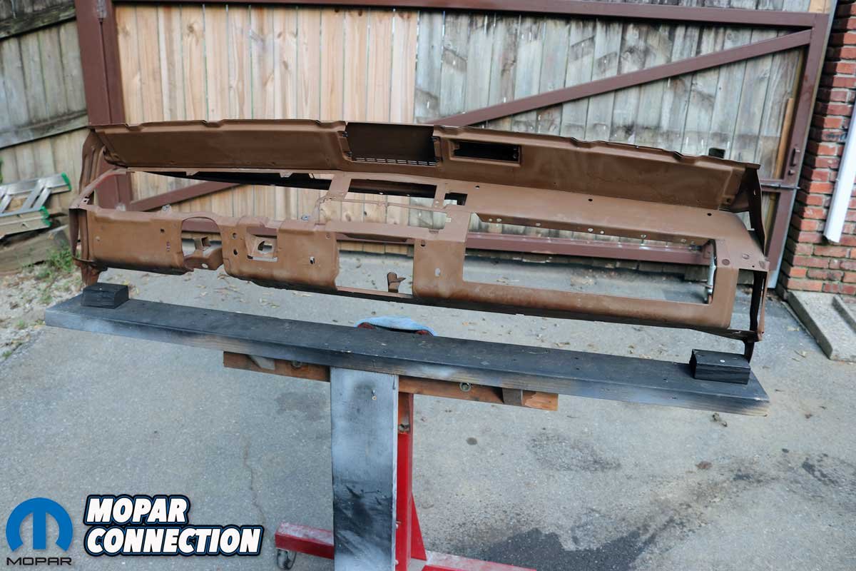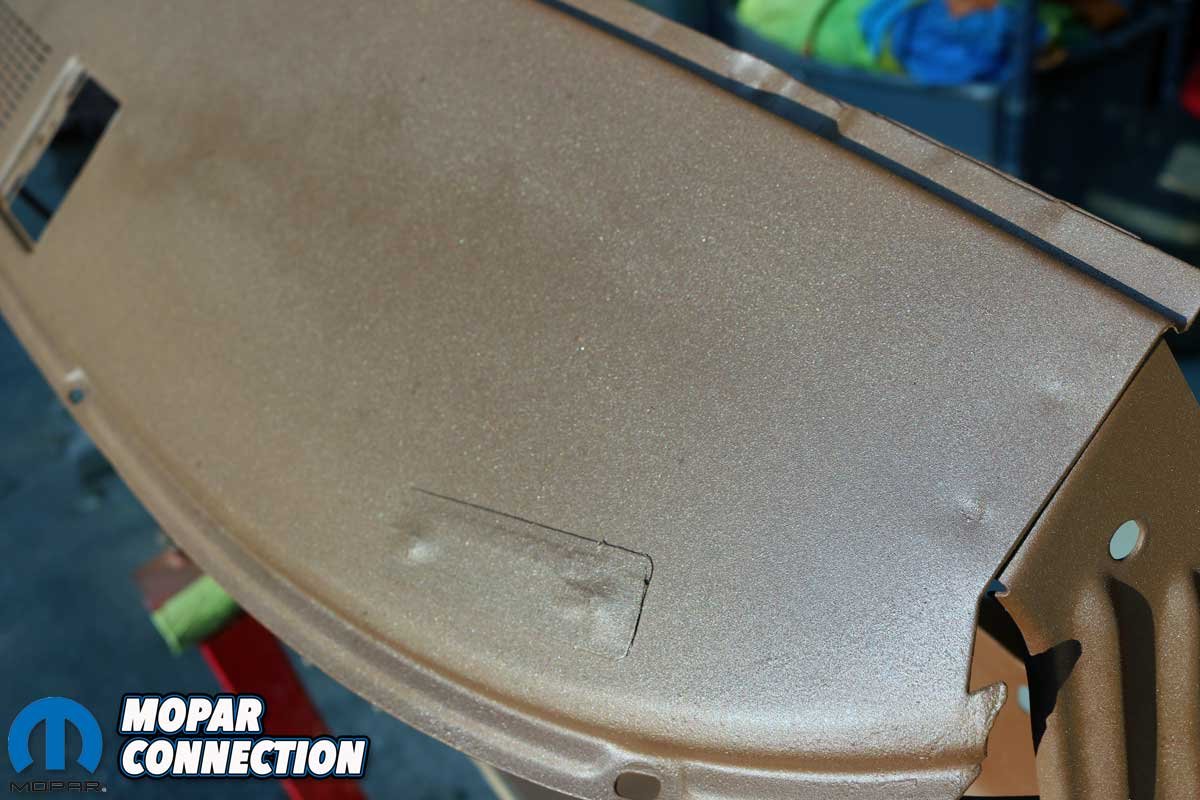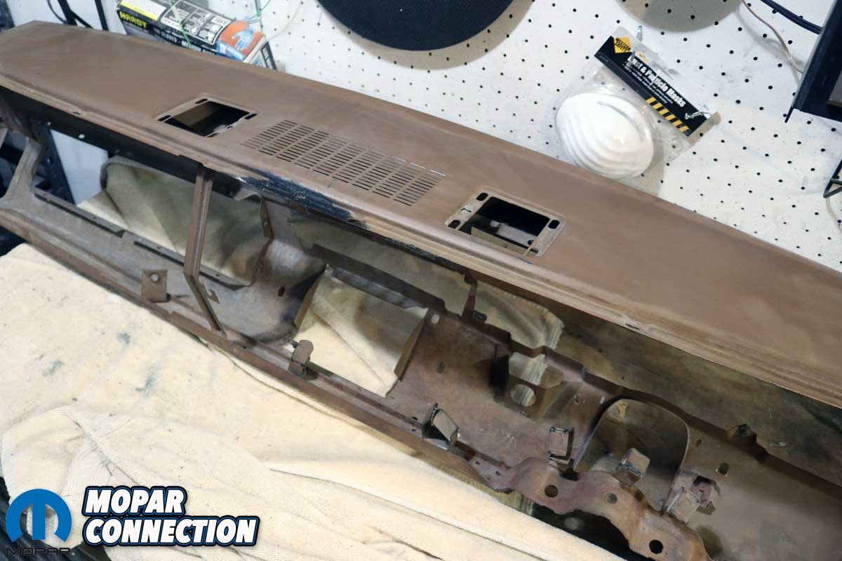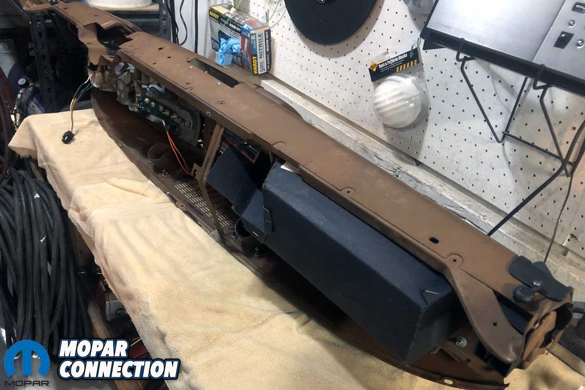 With the dashboard out of Brazen, the disassembly of the dash continued. We removed the instrument cluster and disconnected the glove box and door, the ashtray door and light assembly, vents and grilles, assorted bezels, the map light, a radio delete plate, the ignition switch, and the dash pad from the dash frame. Once the dash was disassembled, we evaluated the damage to the structure, which was minimal, with minor rust located at a corner and the middle, both in proximity to the windshield gasket.