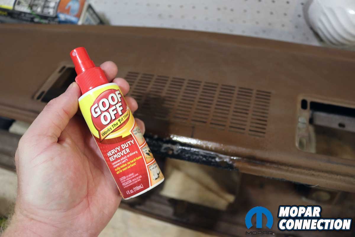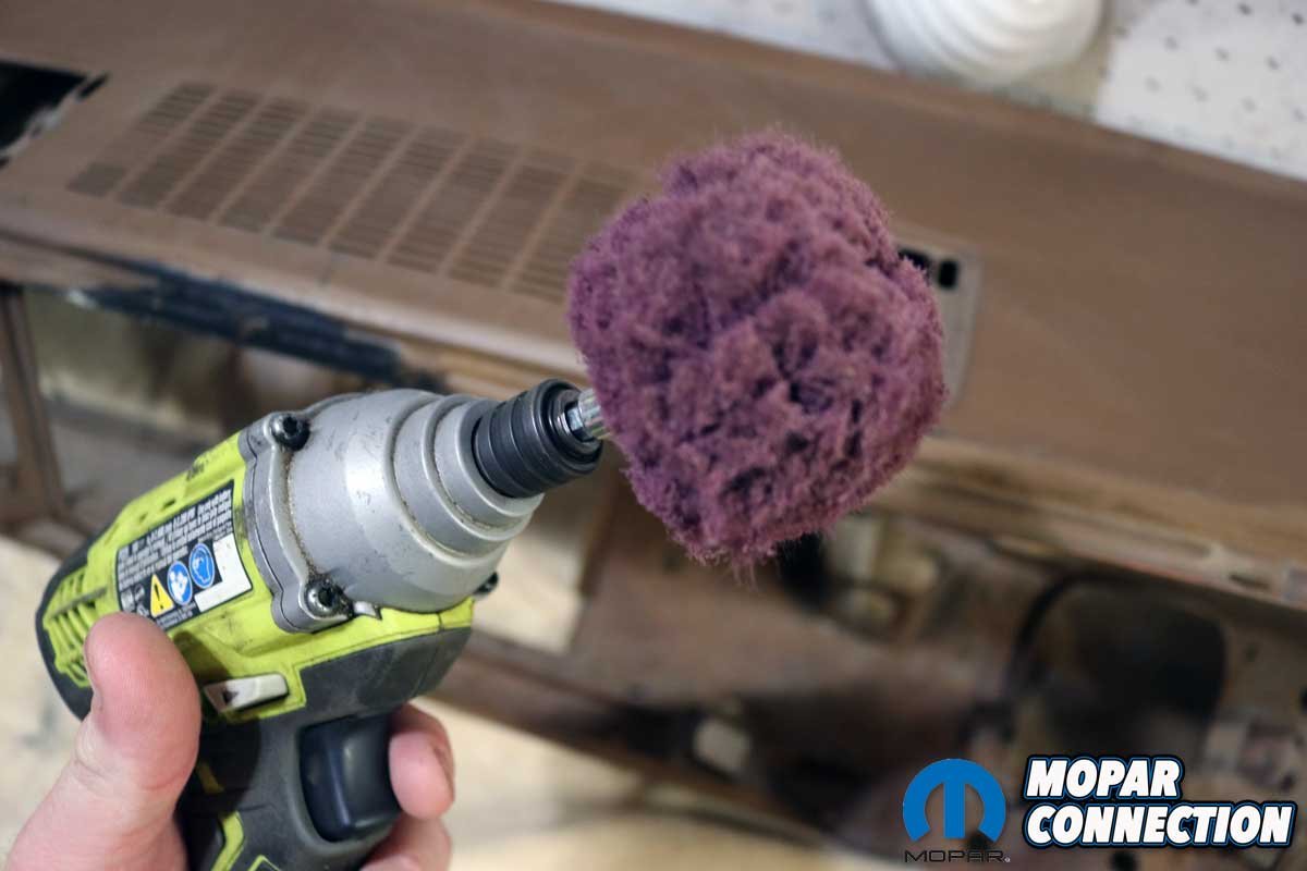 Above Left: We cleaned the dash frame with a red pad in our drill. It took care of most of the cleaning and rust removal. Above Center: At the center of the dash, we used Goof Off cleaner to clean the area caked with heavier debris. Above Right: A drill-driven wire wheel took care of the stuck-on, tough grime.