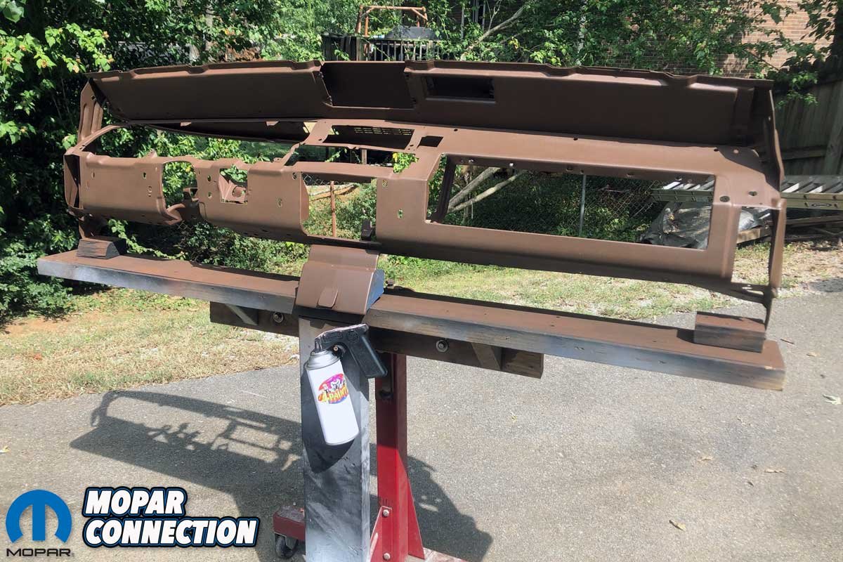 Above Left: We mounted the dash frame to an engine stand. Above Right: We prepared the dash frame for painting by laying down a few light coats of Rust-Oleum paint.