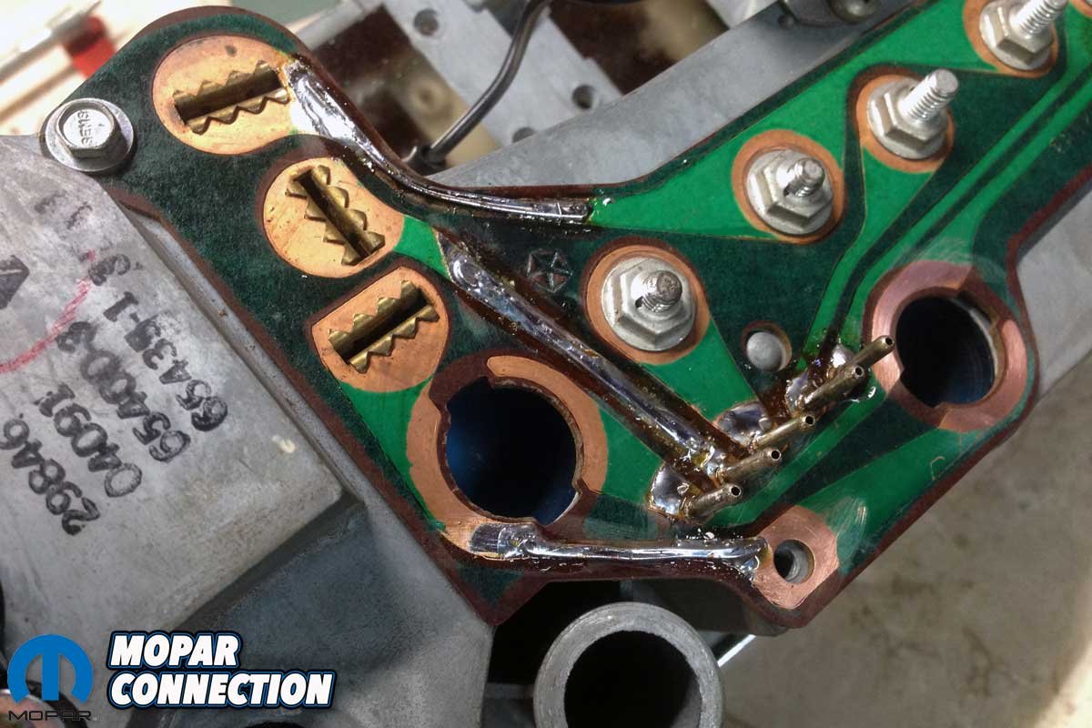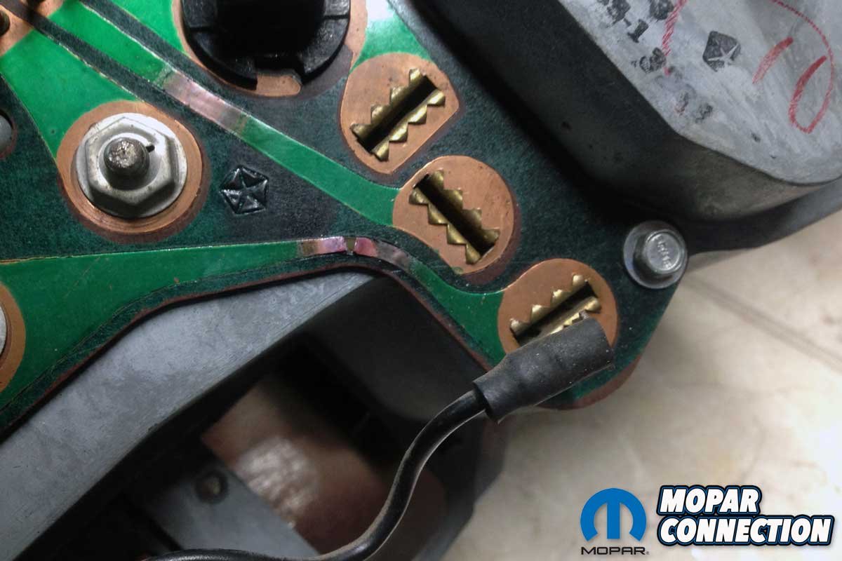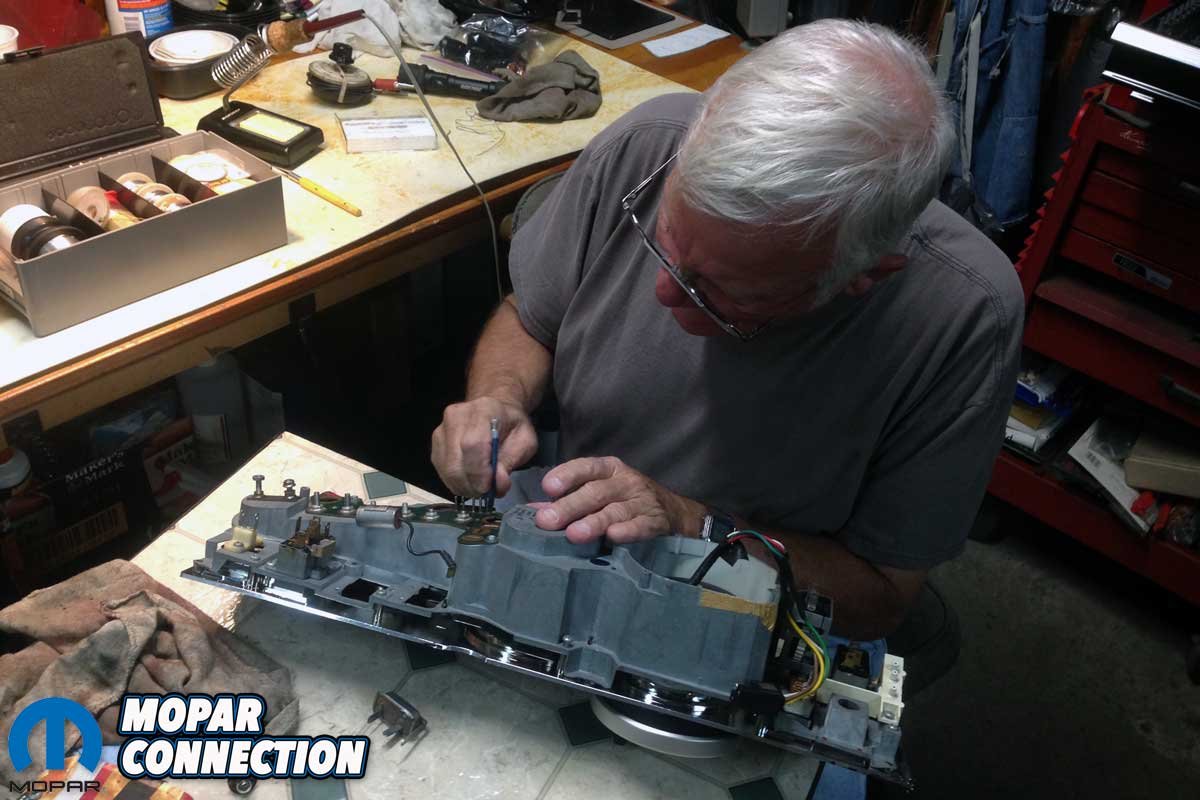 As the painting process continued, we moved our focus to the damaged circuit board on the backside of the cluster assembly. Brazen’s circuit board was severely damaged. Ron Gillespie from the Music City Mopar Club, an owner of a beautiful R4 Red ’70 Super Bee 4-speed, looked over the board and determined he could repair the three damaged areas.