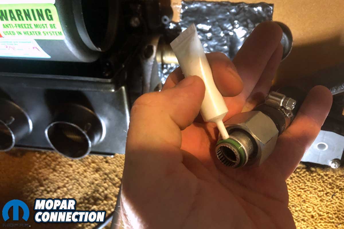 Above Left: We lubricated each O-ring before installing the fitting onto the heater core fittings. Above Right: We installed the electronically controlled heater control valve into the heater line. The heater hose slips over the inlet and outlet fittings on the valve. Hose clamps secured all the heater hoses to the fittings.