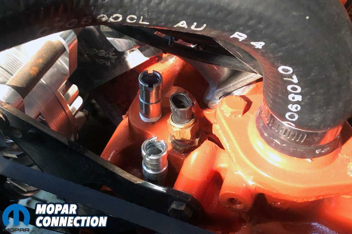 With the interior plumbing completed, we moved to the engine bay to finish the heating system. We had to insert two hose fittings into the engine. One threaded into the thermostat housing to supply coolant to the heater core, and the other was a coolant return from the core to the water pump area of the engine block.