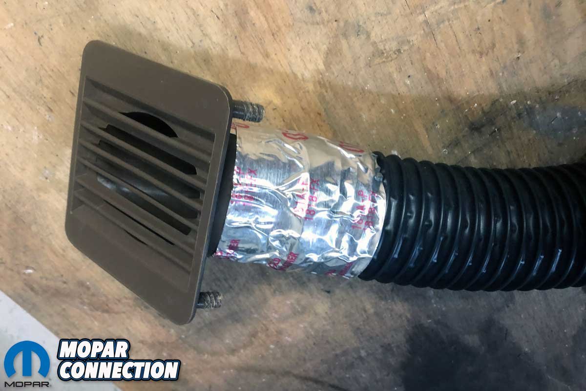 Before we installed the dash frame, we had a few last details to complete. Classic Industries had the dash vents (part no. MB194415) we needed. The vents, molded in brown color to match the dash, were attached to the defrost hoses supplied with the Vintage Air kit. We used silver duct tape to affix the hoses to the vents. Classic Industries also provided juke padding (part no. MB898) and new under-dash courtesy light lenses (part no. MB1500).