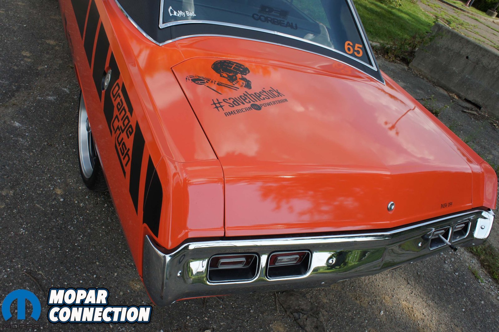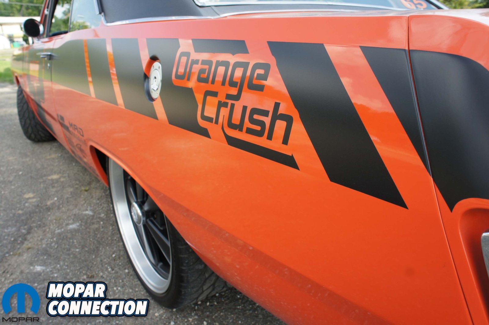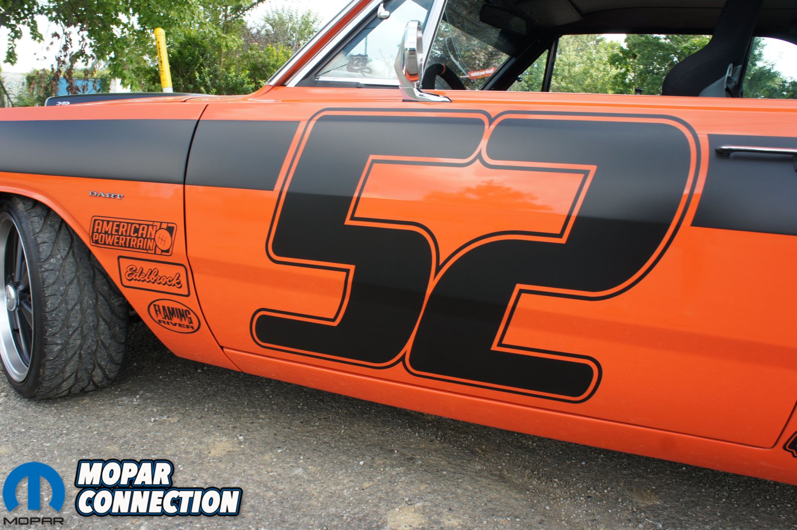 With the various events that we run Project Orange Crush in, we wanted the car to stand apart from the rest. Despite being the only Mopar at many of these events, you would think that a bright orange Dart would be memorable but you would be surprised. We also wanted to be able to showcase all of our advertisers and sponsors that have helped made the car a corner carving beast. We sat and looked through hundreds of pictures for months trying to come up with an idea for a layout.