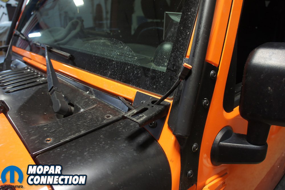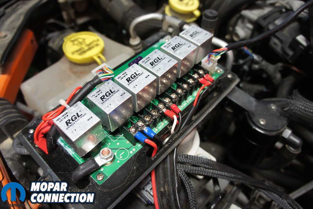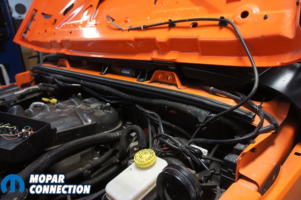 Above Left: Our Raxiom Switch Pod made wiring a breeze. Switches already on the interior and just had to connect the positive and negative to the control box under the hood. Above Right: We strung the wiring across the firewall and up underneath the cowl for the pillar lights.