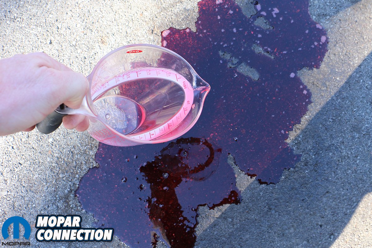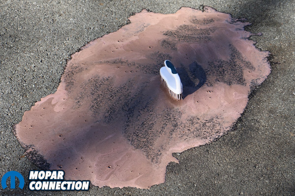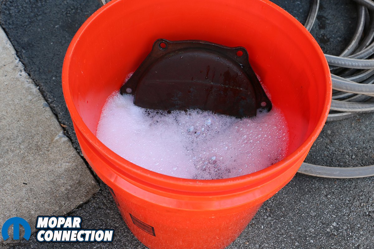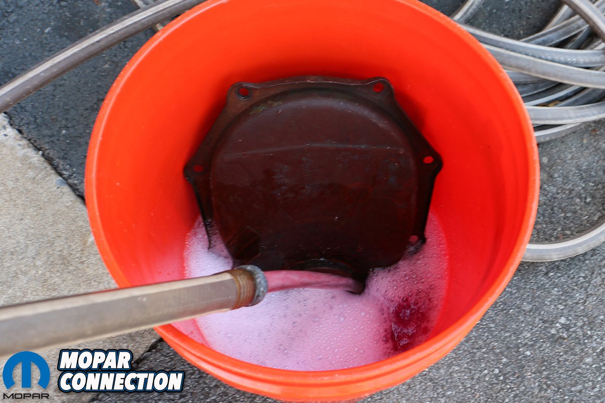 True to his word, the experiment we conducted on a very greasy timing chain cover and a very filthy rear pinion yoke followed as per his description. Our blend was at the recommended 4:1 ratio, meaning 16 ounces per gallon. With a handy 5-gallon bucket and a measuring cup from the kitchen, we filled our bucket 3-gallons high and with 48 ounces of Purple Punch. We let both the yoke and cover soak for a few hours before thoroughly hosing them off. In the pictures, you’ll see that we left a quarter of the cover untouched to show the efficacy of Purple Punch on built-up and baked-on grease, grime and other contaminants. The yoke came out completely grime-free, and even built up some of that white residue Moreno warned about.