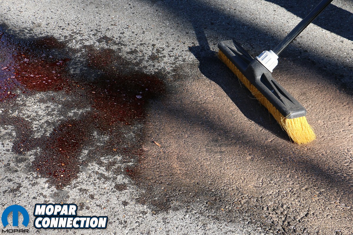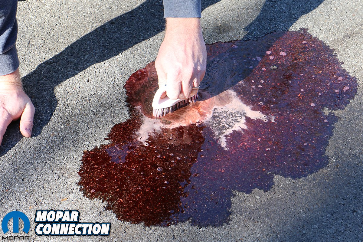 Far Left: One of our most set-in stains from a leaky oil pan on our daily driver. Left and Right Center: We measured out 8 ounces and poured it directly onto the stain. Far right: We began scrubbing with a stiff bristled brush the Red Bull into the asphalt.