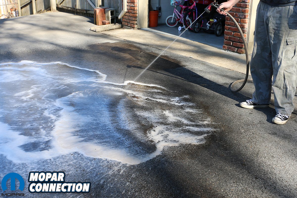When it came to treating our driveway, Moreno had very different recommendations: “Red Bull likes dwell time, so the longer it sits the better the surfactants emulsify the grease and oil. Red Bull (priced at $15 a gallon) is ideal for heavy equipment, concrete, asphalt, engines, under carriages, recirculating parts, washers and floor machines.” His recommended dilutions are as follows: engines (2:1 – 4:1); parts washers (20:1); floor machines (30:1); heavy equipment (2:1 – 5:1); concrete (9:1 – heavy stains – 5:1); asphalt (9:1); general purpose cleaning (15:1 – 30:1); also noting that all dilutions are recommendations only and all dilutions are using a pressure washer or machine. Using a water hose use or simple rinsing may require the product to be used stronger.