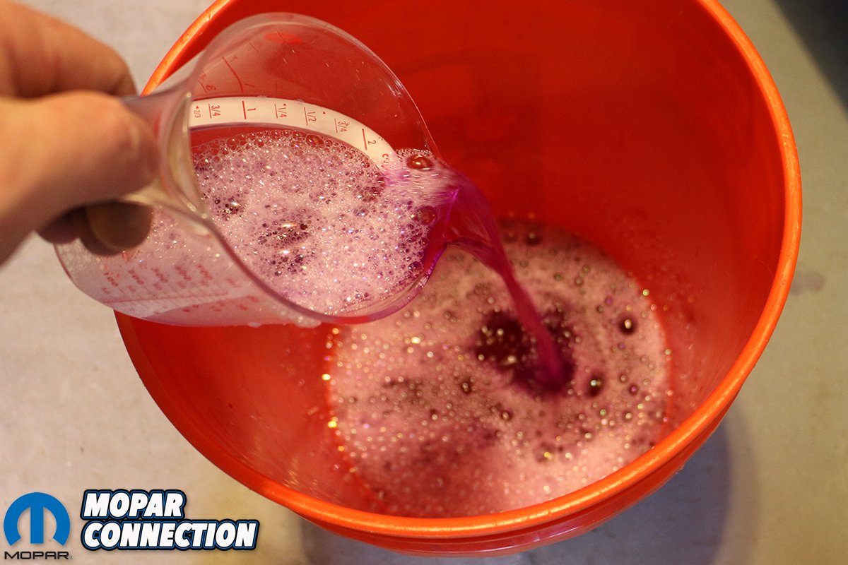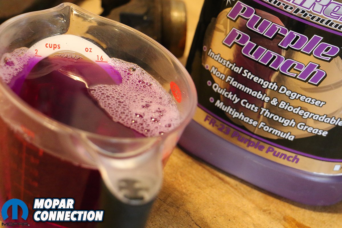 Above: For our first test, we fished out some pretty grimy parts from our parts bin. Because Purple Punch has a recommended 4:1 ratio, meaning 16 ounces per gallon, we measured out 48 ounces of Purple Punch to our 3-gallons of water.