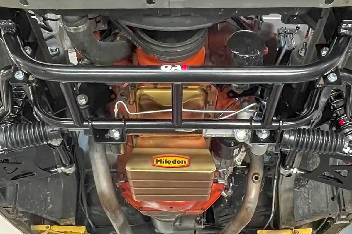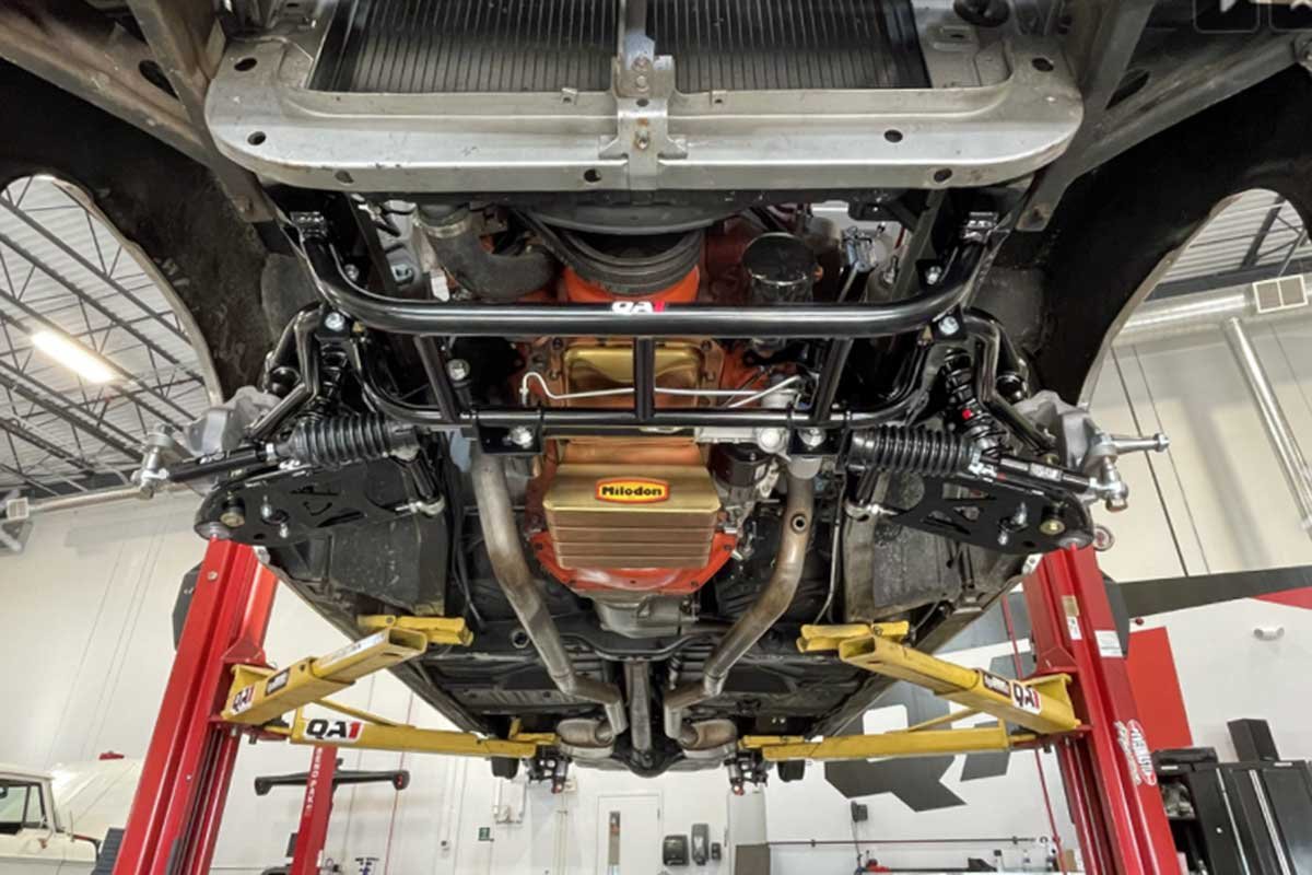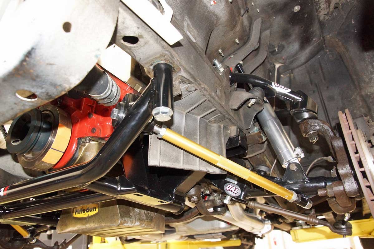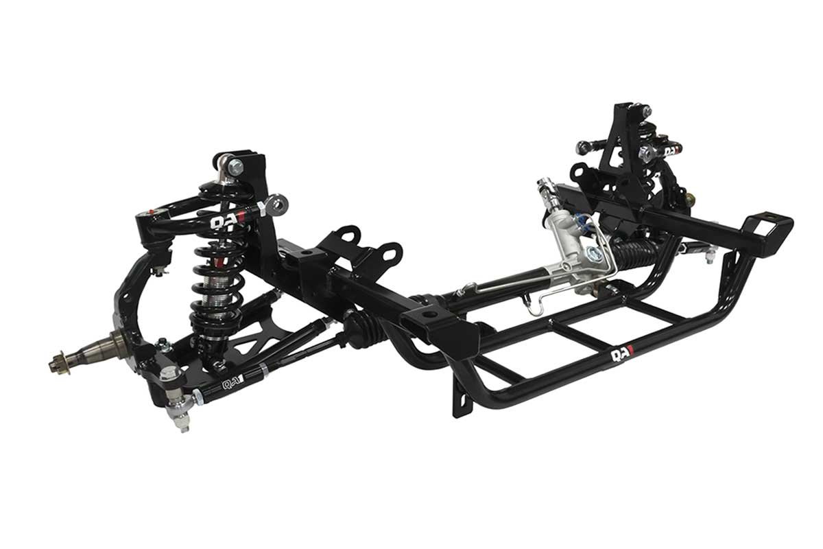 Above: The QA1 coil-over kit comes with a tubular k-member, reducing weight and making room for big-tube headers. The tubular control arms provide modern geometry for improved handling and drivability. A powered rack-and-pinion steering delivers a modern car feel. In addition, the k-member has modular engine mounts that accommodate several different engines.