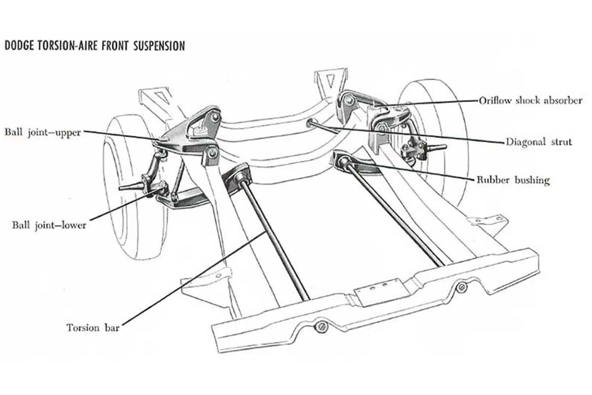 The torsion-bar front suspension debuted in 1957 across all the Chrysler Corporation models. Chrysler advertised the suspension for some years under the trademark name “Torsion-Aire.” After a layout reengineering in 1976 on the F-body platform, Chrysler would continue using the torsion bars on the rear-wheel-drive layouts until the end of production of the 1989 M-bodies. However, Chrysler did use a front torsion bar system on some generations of the Dodge Dakota and Durango.