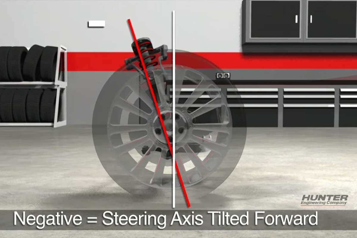 Above Left: Because many of the older Mopars did not have power steering but were substantially heavy, negative caster (tilt of the steering axis forward compared to vertical as viewed from the side) allowed for ease of steering. Above Right: As power steering became more prominent, manufacturers began moving to positive caster (tilt of the steering axis rearward compared to vertical as viewed from the side) to promote directional stability and steering wheel returnability. (Hunter Engineering Photos)