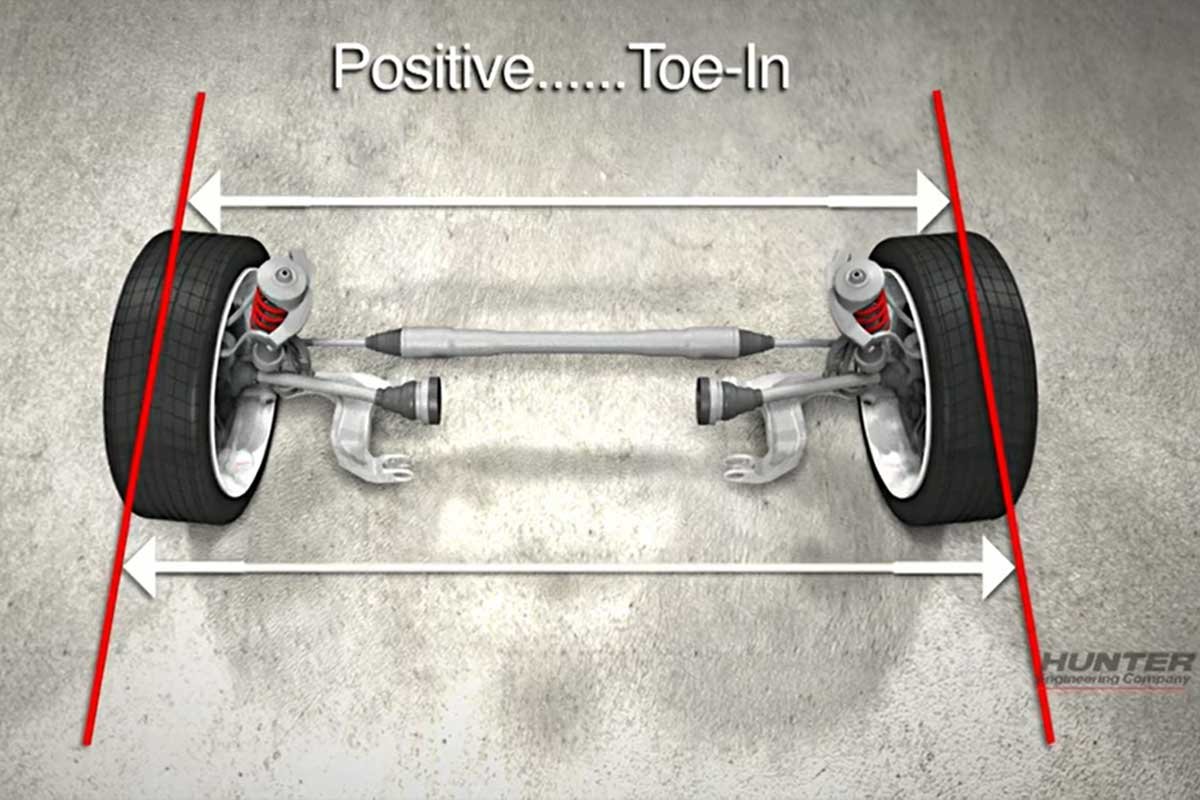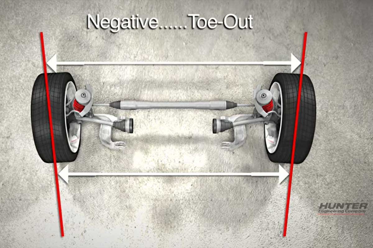 Above Left: Nearly every manufacturer recommends a small amount of toe-in (the distance between the front of the front tires is less than the distance between the rear of the front tires). (Hunter Engineering Photo) Above Center: Occasionally, there is a toe-out (the distance between the front of the front tires is greater than the distance between the rear of the front tires) recommendation for performance road course racing. (Hunter Engineering Photo) Above Right: Bump steer is a condition that occurs when the front toe changes due to bumps in the road without driver steering input. Therefore, it is imperative to line up the ball joints and the outer tie rod end (steering axis) and align the inner control arms and inner tie rod end (line 2) to keep the movement of the components in the same arc to minimize bump steer.