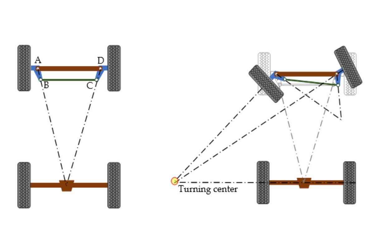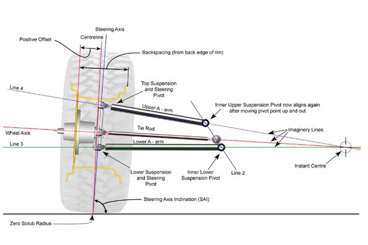 Above Left: When a line is drawn through the lower ball joint and outer tie rod end on each side of the car, they should intersect at the rear differential. The steering geometry of the intersecting lines is known as Ackermann angle. The Ackermann angle causes the wheels to toe out when the steering wheel is turned. Some alignment shops and dealerships refer to Ackerman as toe-out on turns. Above Right: A roll center is a theoretical point around which the chassis rolls and is determined by the suspension’s design. The roll center can be moved by changing the angle of the control arms.