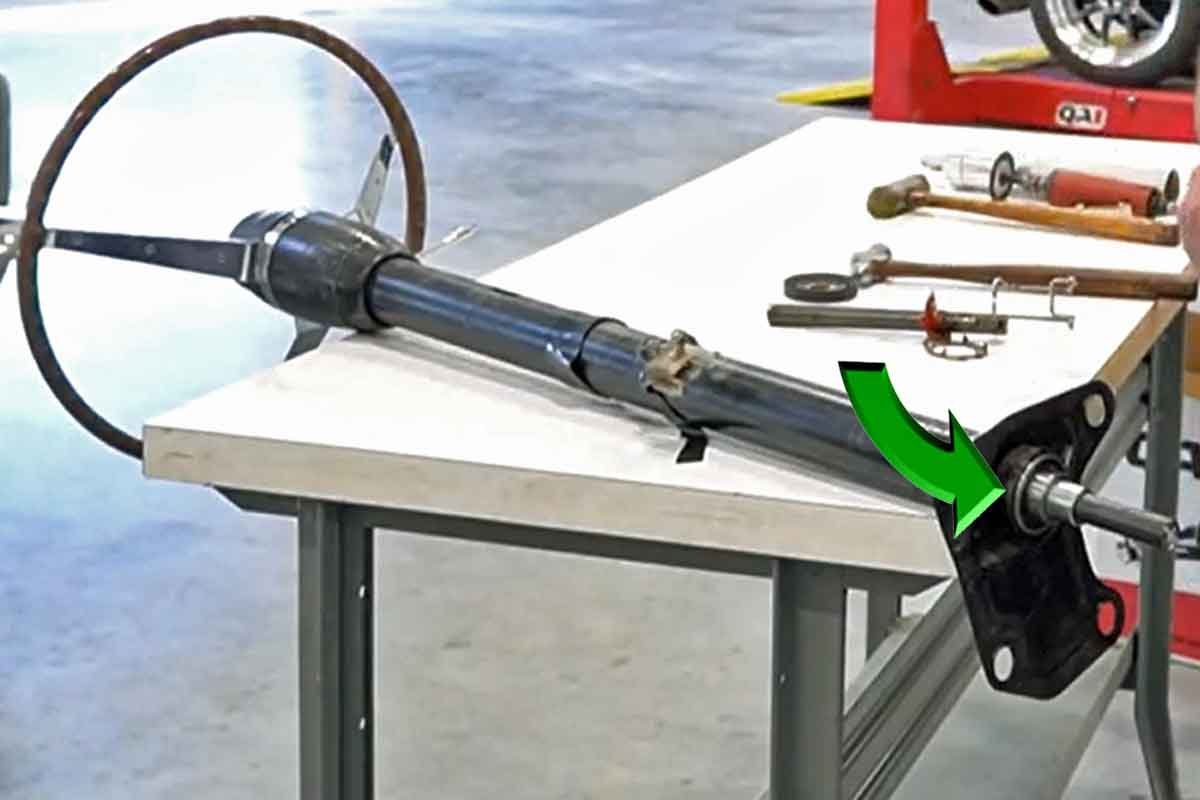 Above Left: Mustang II-style spindles offer a wide range of brake options. Wilwood brake configurations are available from QA1. Above Right: The factory steering shaft must be shortened, and a bearing support (green arrow) must be pressed (carefully tapped) into the lower column. A U-joint and shaft must be welded to the factory shaft to attach the factory steering shaft to the rack-and-pinion. The only welding for the entire installation is the steering shaft.