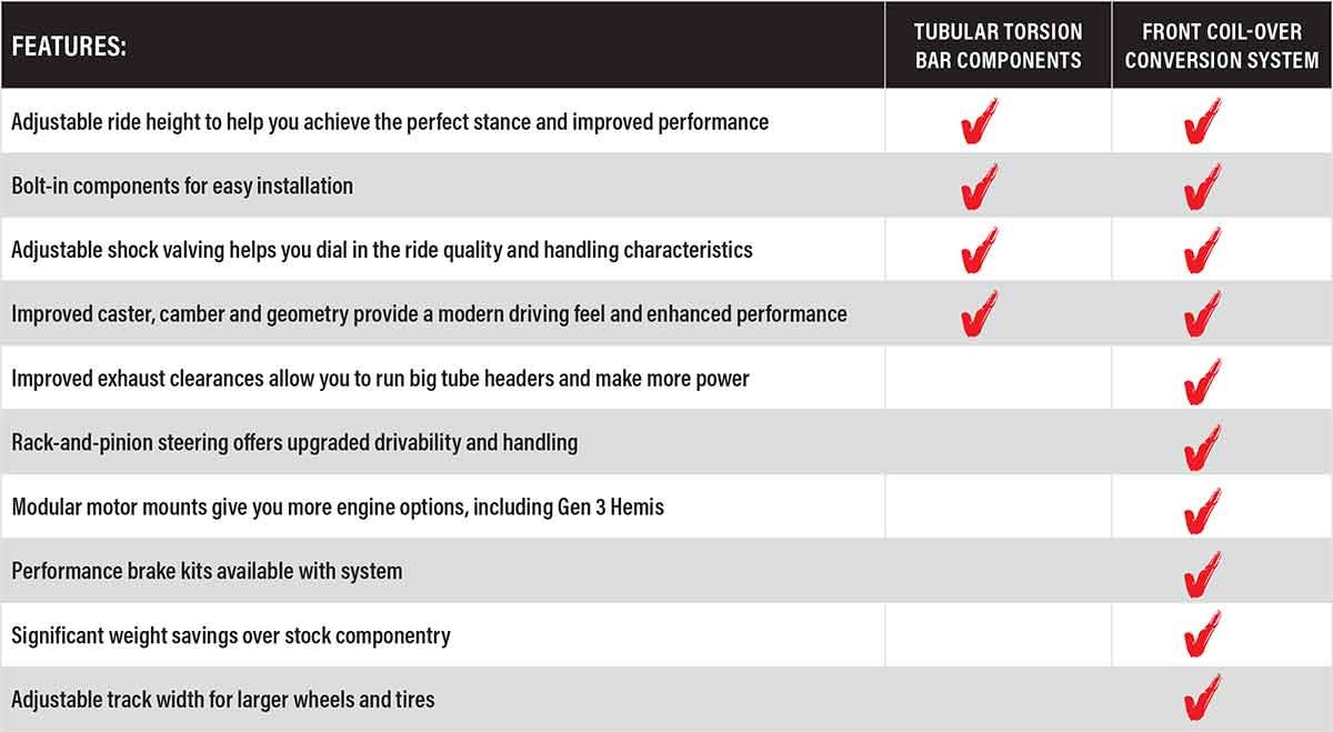 Above Left: Chrysler introduced the torsion bar front suspension in 1957. QA1 updated the suspension components to increase the rigidity and allow greater adjustability. Above Right: To optimize the front end of the muscle-car era Mopars, QA1 developed an updated coil-over front suspension. The coil-over suspension utilizes all the latest technology, exceeding the factory design and performance.
