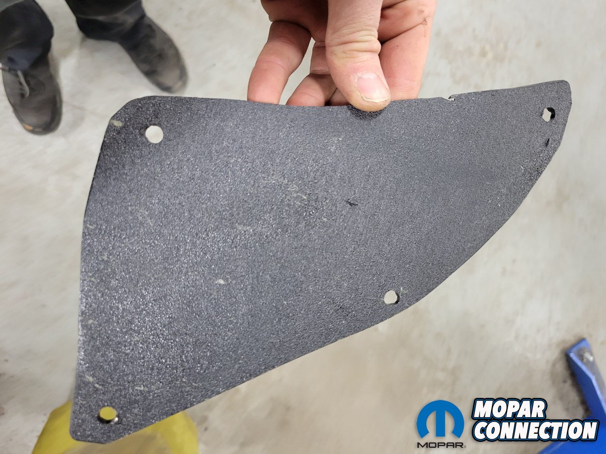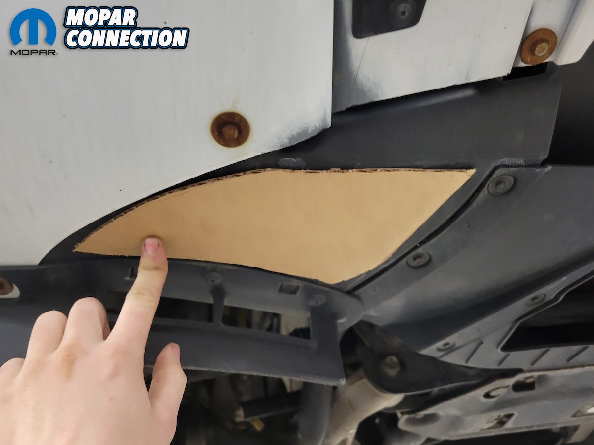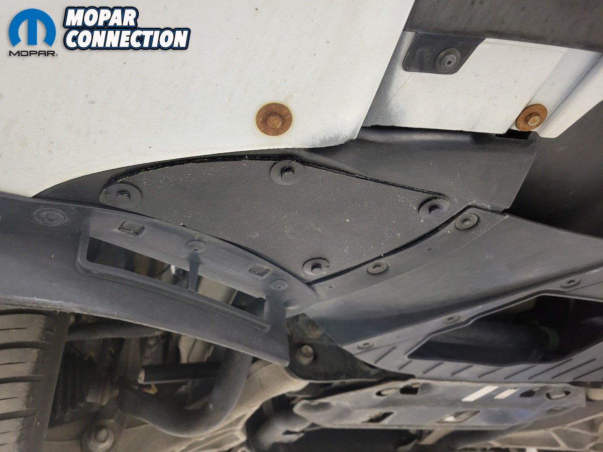 Placing the newly made ABS plastic cover against the bottom of the splash shield, we drilled four holes, then placed four push pin clips to securely hold it in place, giving it almost a factory look.