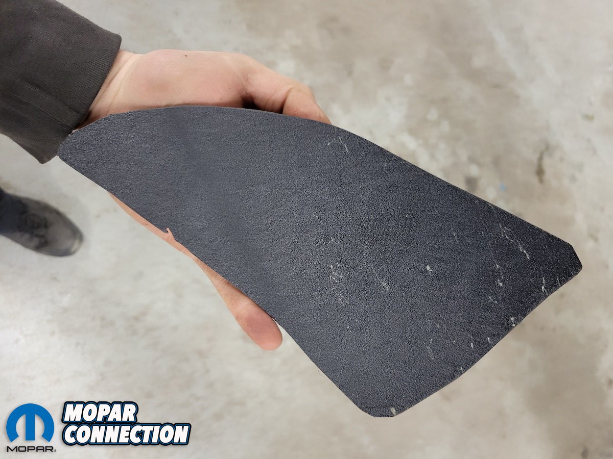 We used a carbine bit on a dye grinder to cut a hole into the splash shield to gain access to the cooler, making sure not to go too big so we have material to attach a new cover that we will be making. We made a cardboard template before transferring it to a sheet of ABS plastic.