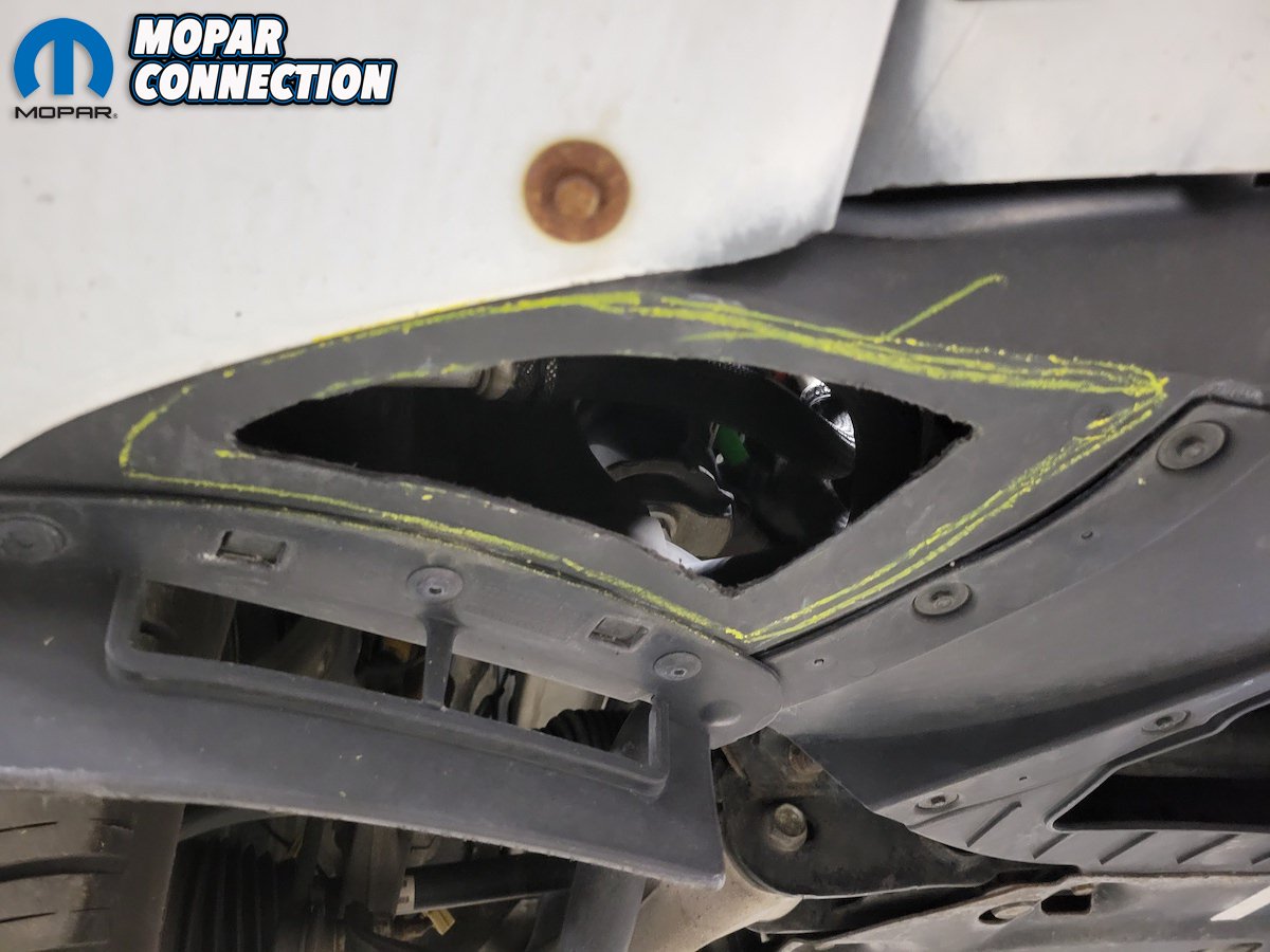 We started by lifting the Jeep all the way up. After looking it over, we decided the easiest way was to cut a hole in the bottom of a splash shield directly below the engine oil cooler (making sure we weren’t going to cut through any oil lines or wires on the backside of the bumper).