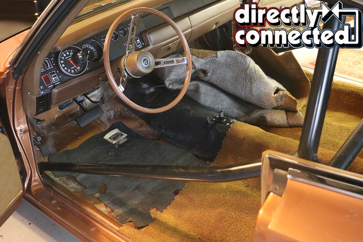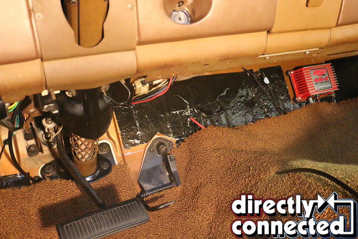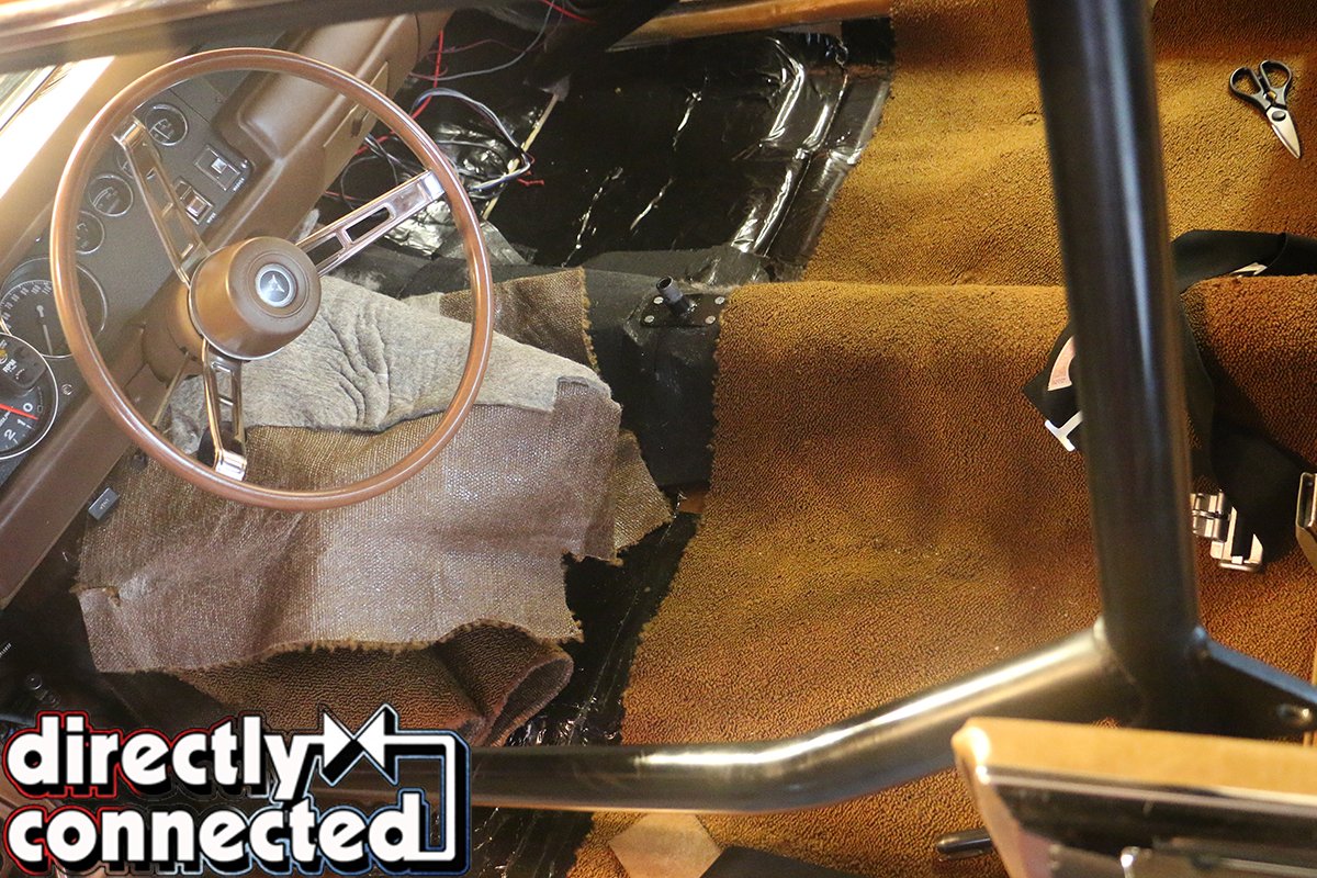 Above left: We began our interior installation by removing our bucket seats, shifter, door sills and kick panels. The two-piece loop carpet was easily removed from the rear, but because of our TCI Outlaw shifter’s cable, it was easier to just fold the front carpet over to one side. You’ll also note our EVA sound deadener that we installed years earlier. Above right: Prior to applying, we laid out one side first, marking where to cut around the pedals, highbeam switch and steering column.