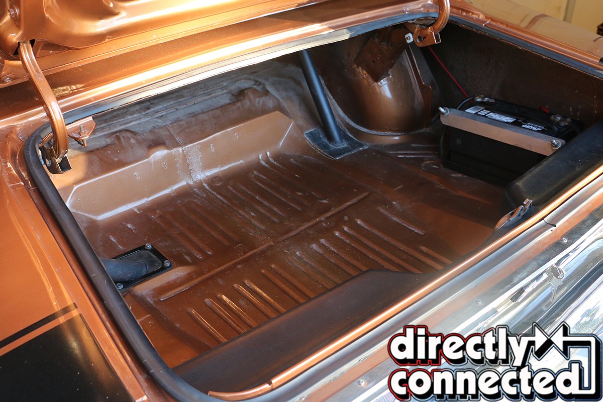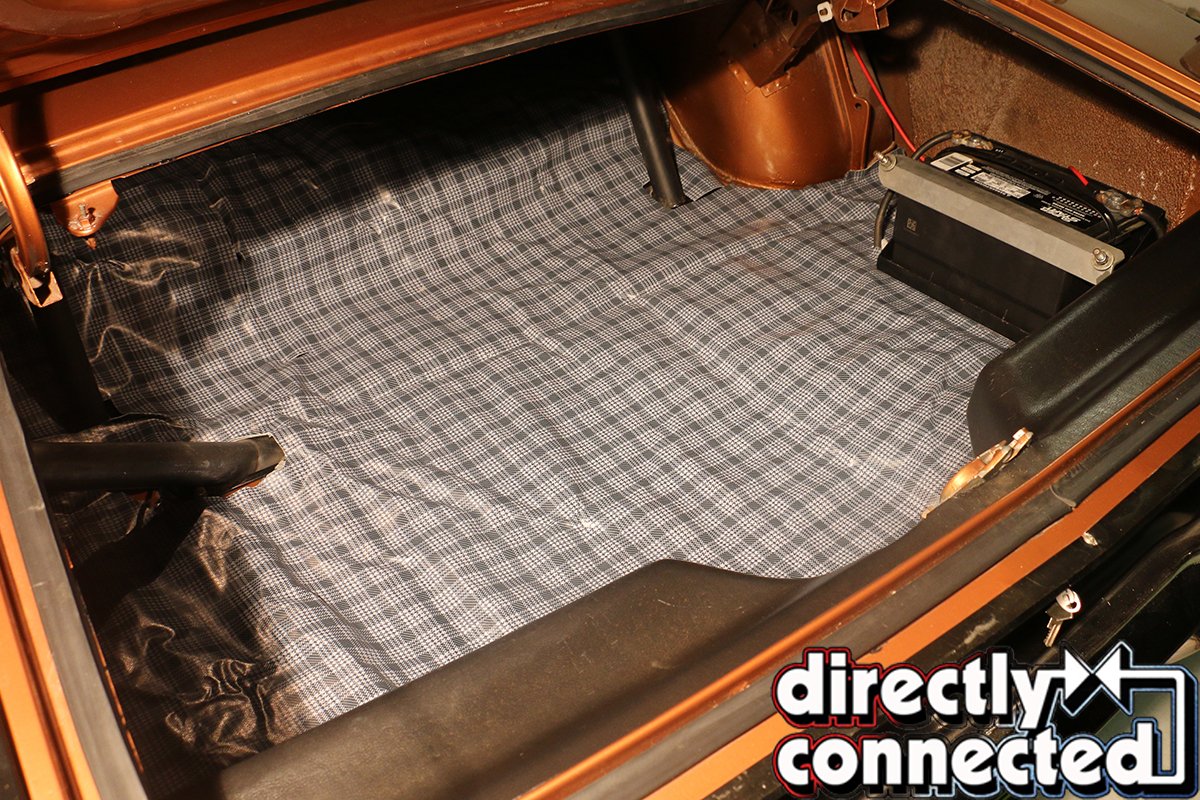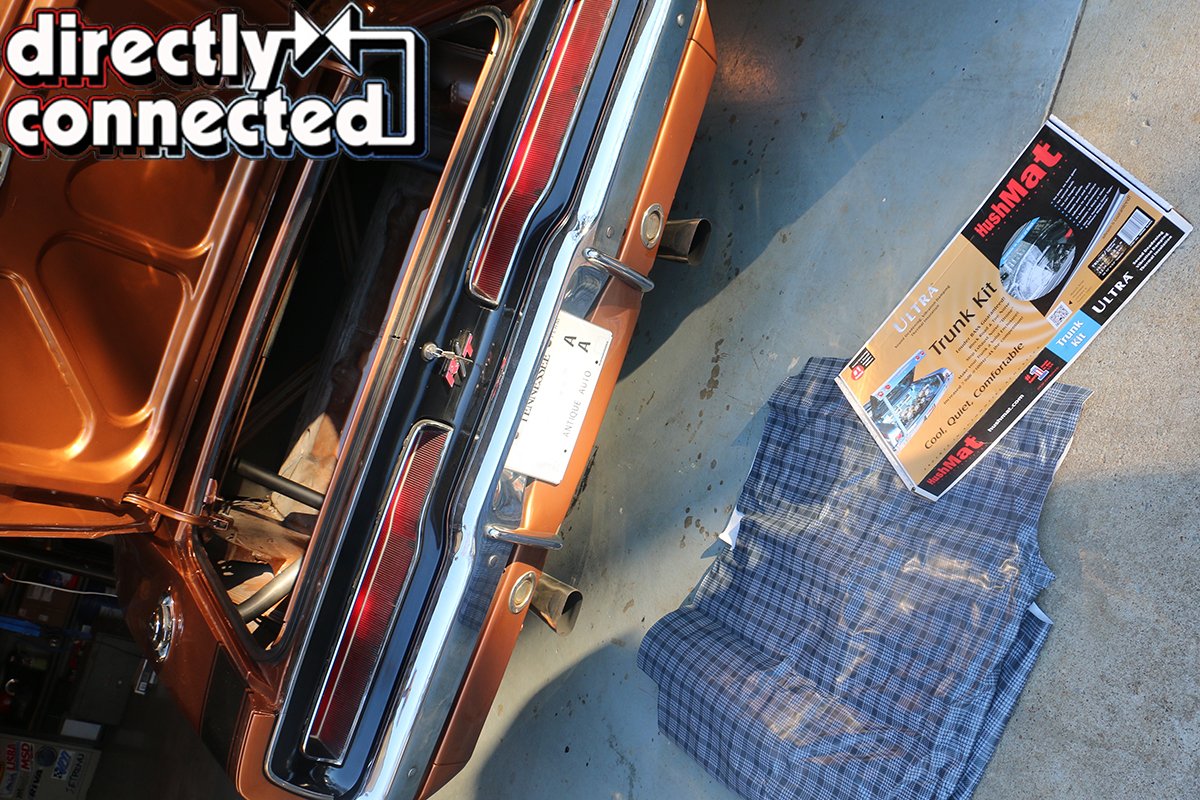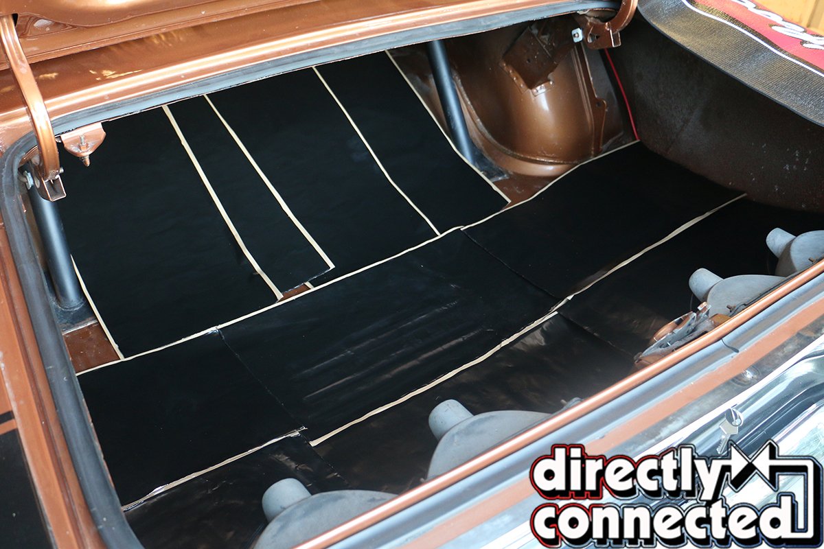 Since we were going to be coating the surface of our trunk, we also put in for one of Classic’s Fleece-backed vinyl trunk mats. Available in either herringbone, houndstooth or plaid, the mat is precision die-cut to the original specifications, which of course, given our roll cage and trunk mounted battery, would require some custom trimming to boot. Not only would it toss in a dash of showroom originality in an otherwise not-stock street machine, but also cover up the sound deadening material.