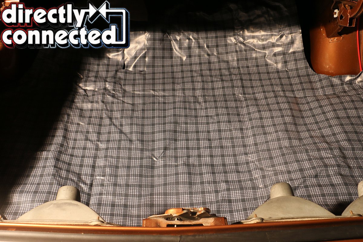 Above left: Although a far more open area, covering our trunk also proved one of the more time-consuming portions of the project. Above center: First went out battery tray. Above right: And then our plastic OE brake light cover.