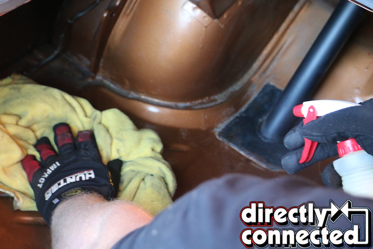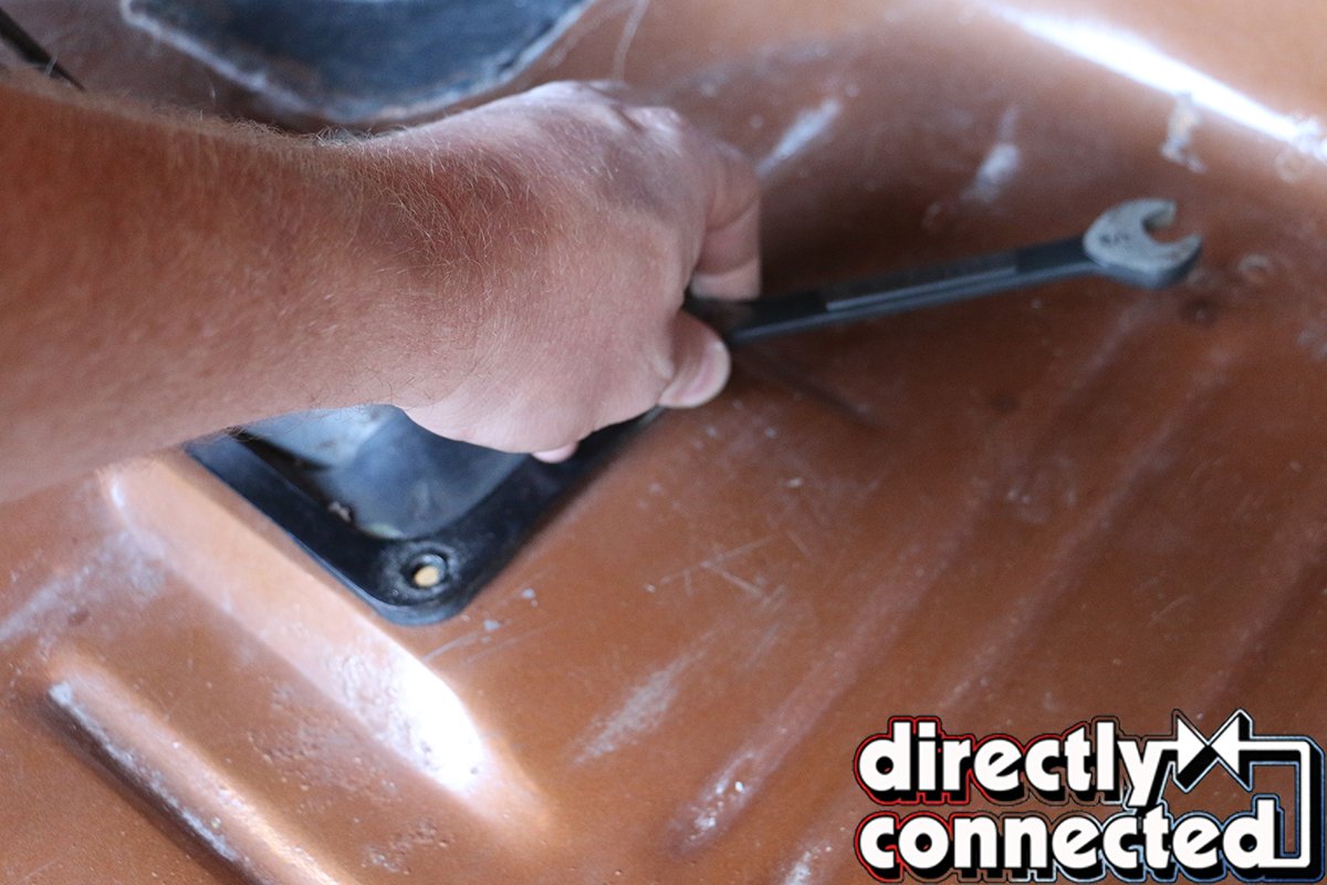Above left: Although theoretically one could install the HushMat in the trunk without removing the filler neck, we thought it best to be thorough. Above center: The filler neck twists out (once the breather tube is removed). Remember to stuff a clean rag into your gas tank to keep any debris out (and from fumes escaping). Above right: Although HushMat swears its unnecessary, we gave our trunk a quick wide down before applying the sound deadener.