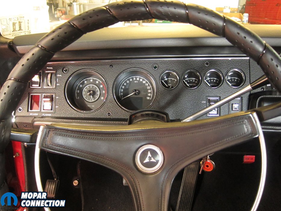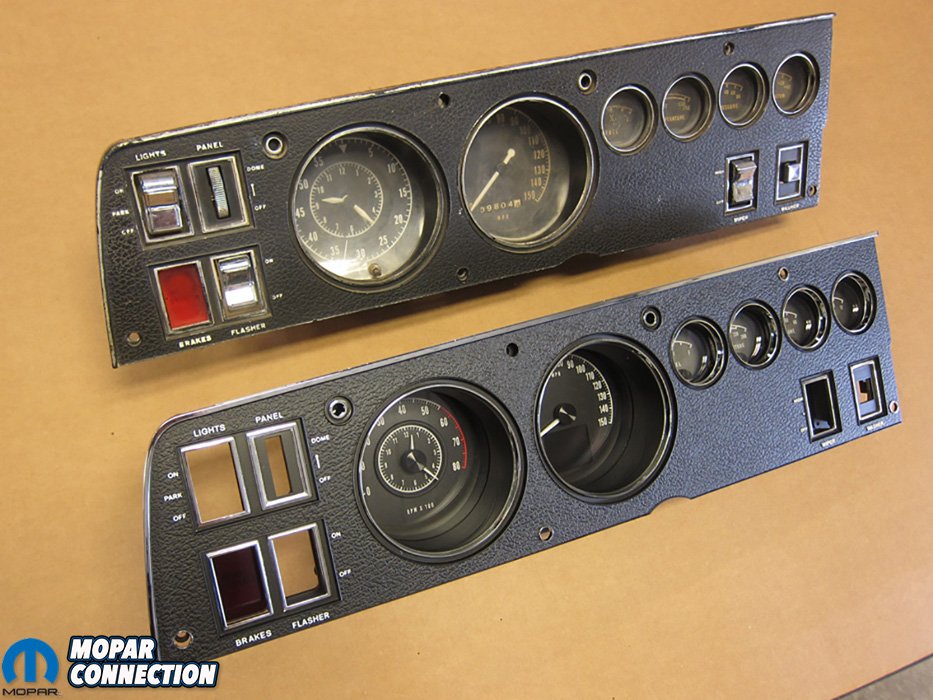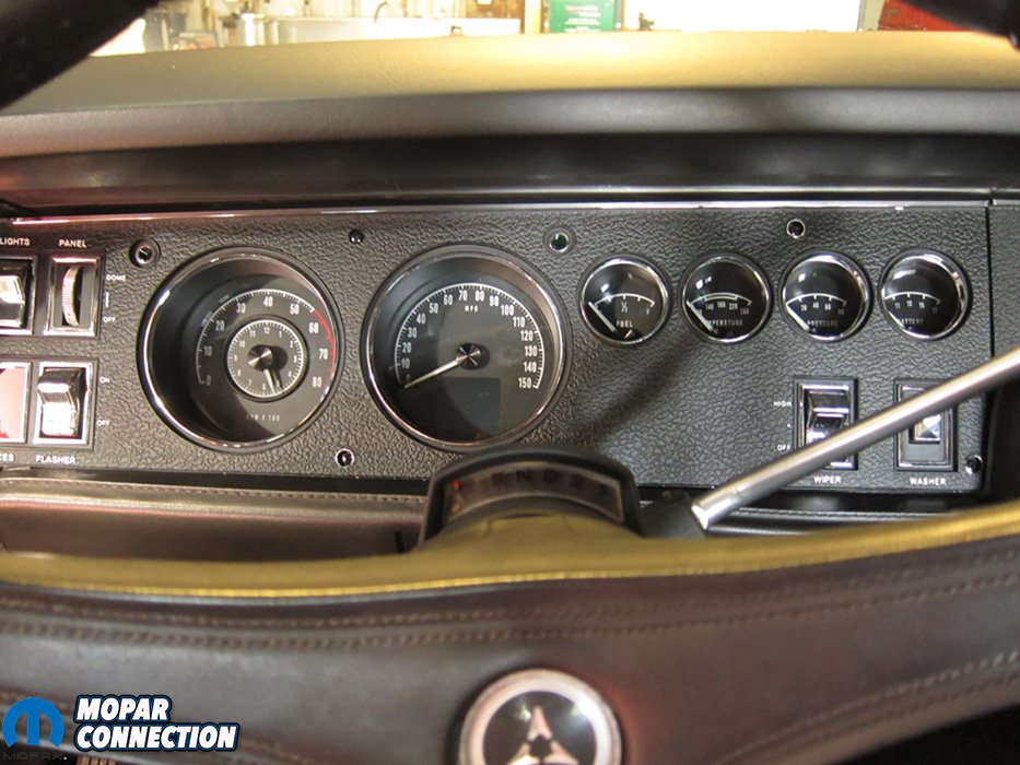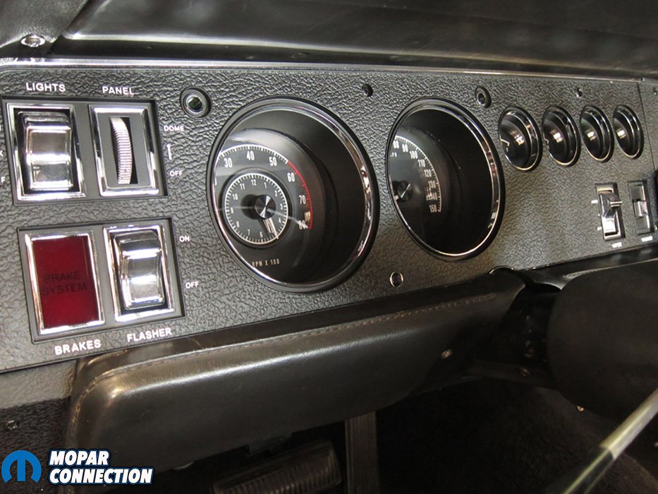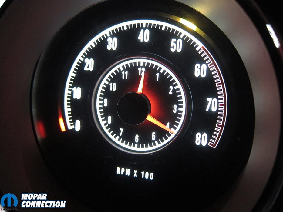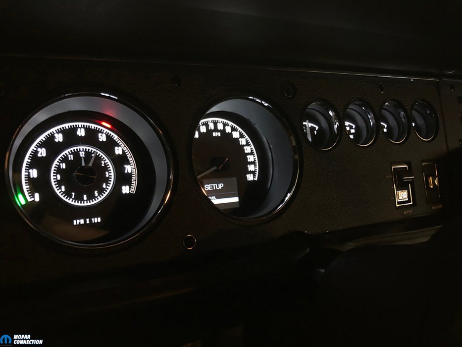 Standard equipment on Super Bees and Chargers and optional on Coronet R/Ts, the Rallye dash was represented by code A62 on the fender tag. The only variability between dashes was in the leftmost hole; a blank-off plate was standard, J21 on the build sheet stepped it up to a clock, and the famous Tic Toc Tach got code N85 on the fender tag. Used Rallye clusters command big bucks and restoring them isn’t cheap. A set of replacement gauges will set a guy back more than $900 while doing nothing to upgrade dated analog instrumentation technology.