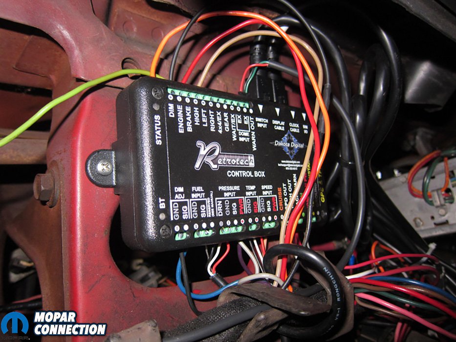 Also part of the wiring process was the installation of three included sensors for oil pressure, water temperature, and the speedometer. Each included a pre-terminated cable so individual wires didn’t have to be run and all of them screwed into the original threaded connections. Even the speed sensor threaded right onto the stock speedometer gear housing on the transmission. One big benefit of the RTX’s electrically-driven speedometer is that its auto-calibration makes rear gear or tire changes a breeze. Swapping expensive plastic speedo gears is no longer necessary as the RTX control box can automatically adjust to whatever gear/tire combination the user might choose.