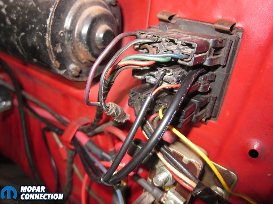 We didn’t want the oil pressure and temperature sensor wiring to stand out in the engine bay, so those went through the factory bulkhead. A couple of Packard terminals took care of the two temperature wires. Since the original ammeter wires were long gone after an alternator upgrade, a hole was drilled through one of those unused terminal slots and the oil pressure cable was threaded through it.