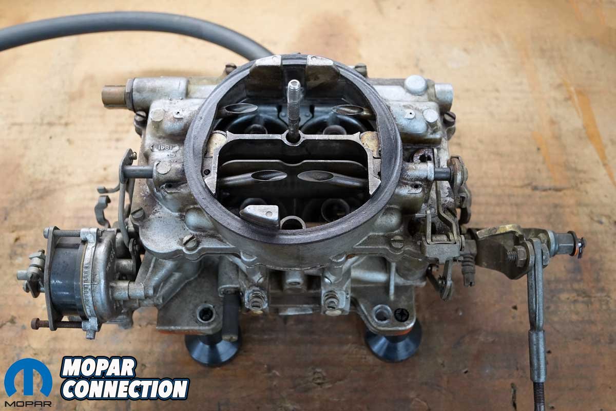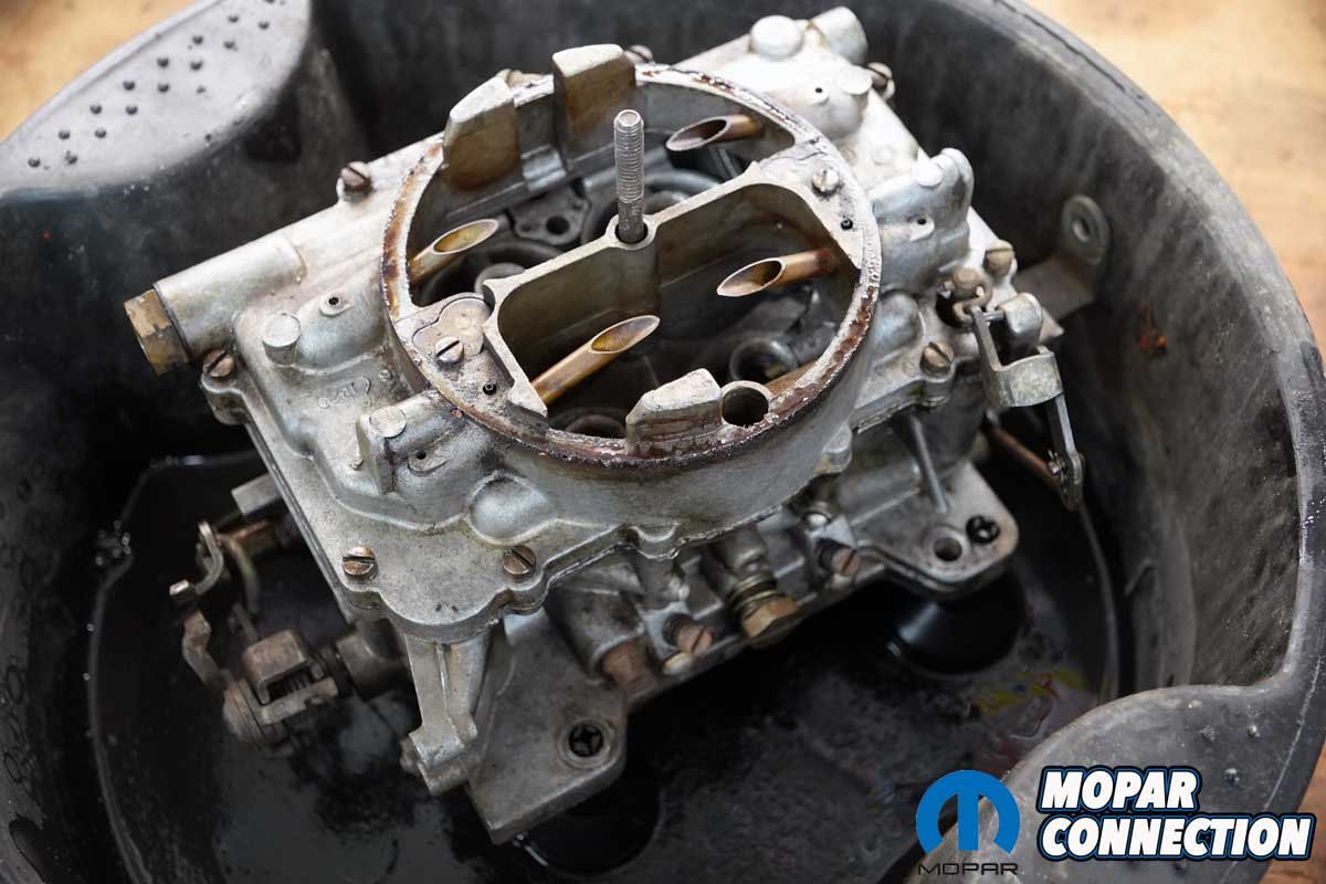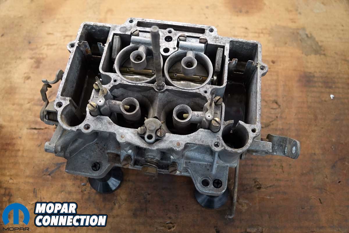 We followed the same procedure for the rear carburetor. However, it did not have an idle air bleed circuit screw, but it did have a choke and linkage, a PCV provision, and a vacuum advance port. Like the front carburetor, we disassembled it to a bare main body and an air horn assembly. Every internal part was soaked and then sprayed with carburetor cleaner to ensure each part was clean and gasoline could flow through the various passages.