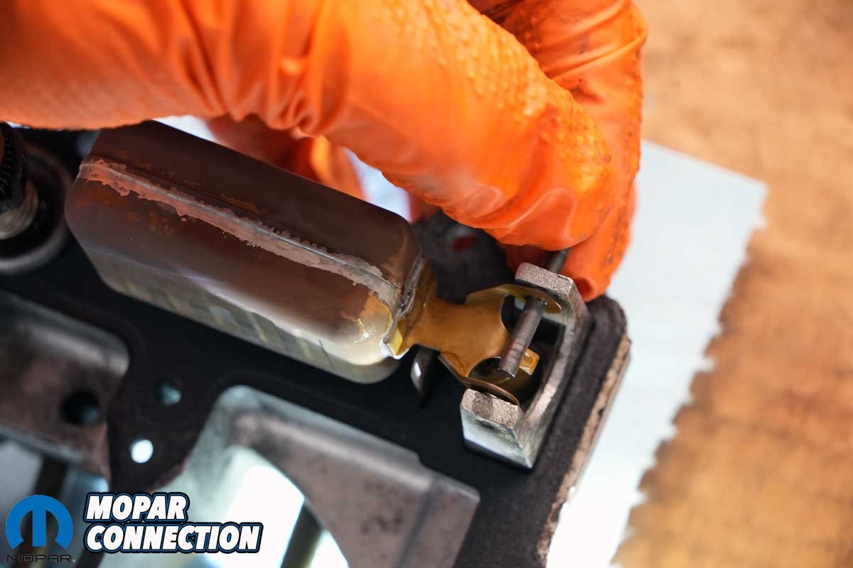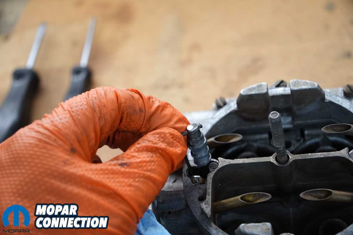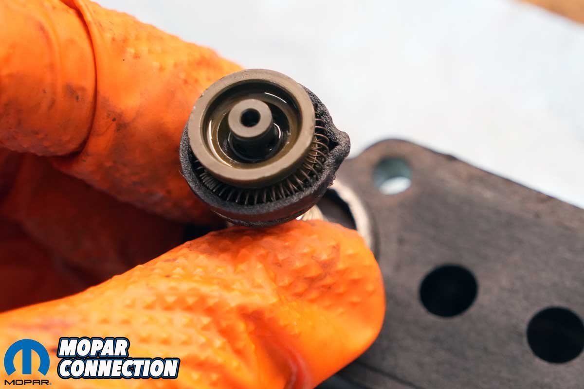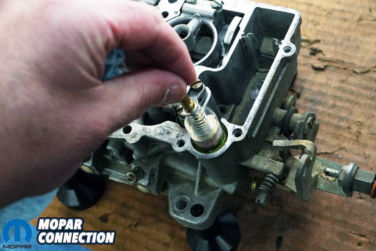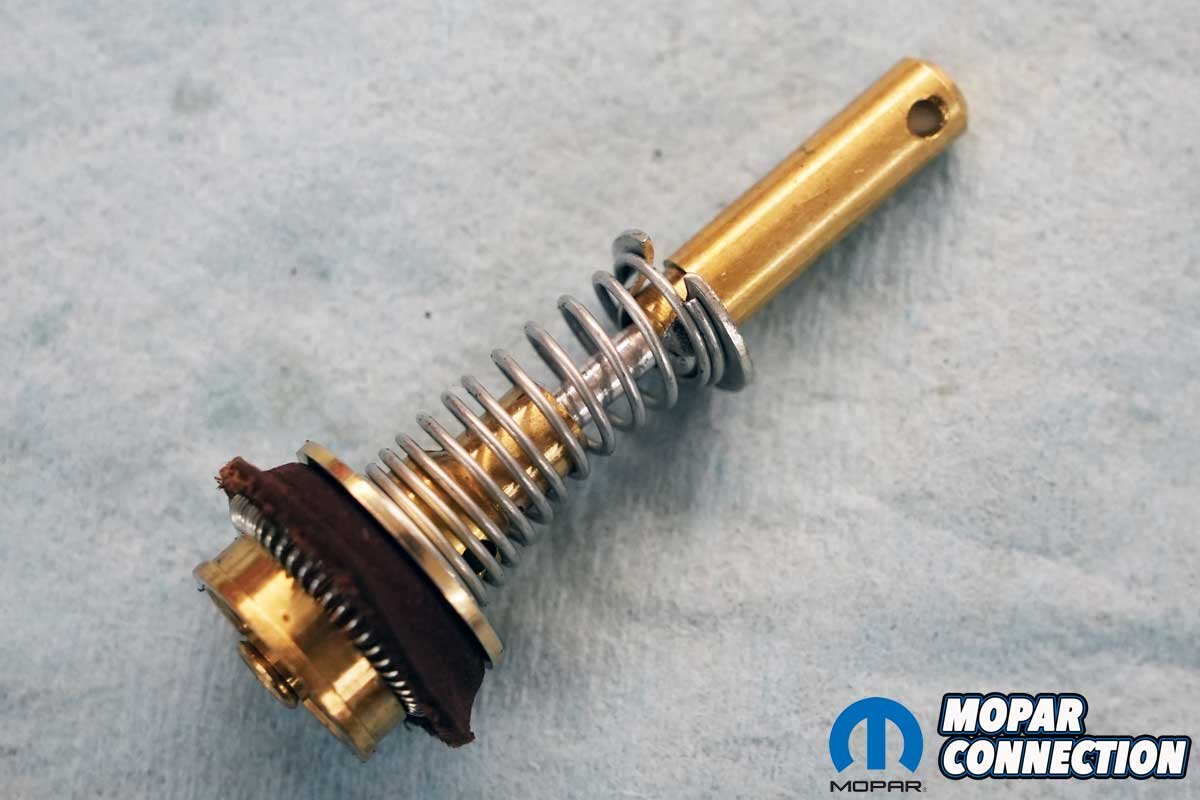 To fit the new accelerator pump leather gasket into its bore, we added a few drops of gasoline to the leather and then wrapped it in transparency film lubricated with Vaseline. We filled the accelerator pump well with gasoline, added the return spring, and slipped the pump assembly into the well in the main body. After removing the transparency film, we depressed the accelerator pump stem and noticed a stream of gasoline expelling from both discharge nozzles. When we released the stem, the accelerator pump returned to its normal location.