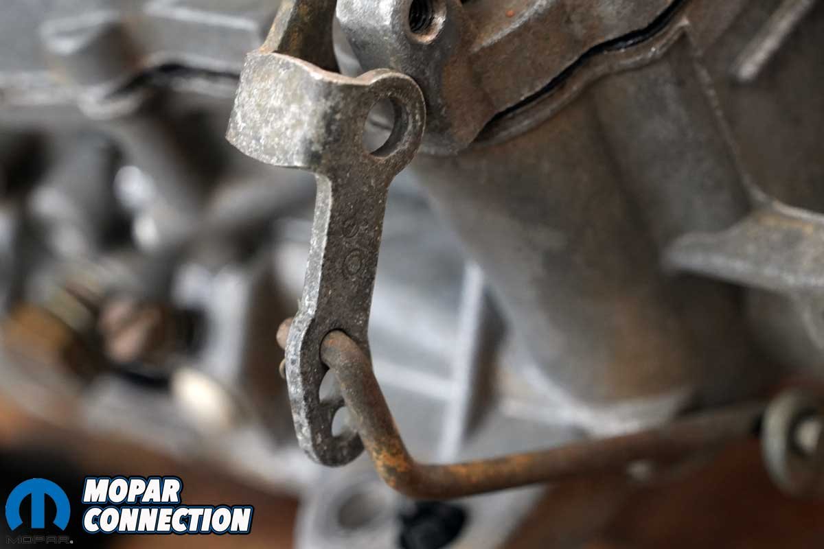 Although the front carburetor was not the correct year, the throttle cable, throttle linkages, return springs, and kick-down linkages were all present and appeared to be original and accurate. Except for the front carburetor’s accelerator pump linkage pivot bolt missing and the rear carb’s poorly adjusted choke linkage, the carbs looked complete, just dirty and varnished from old fuel.