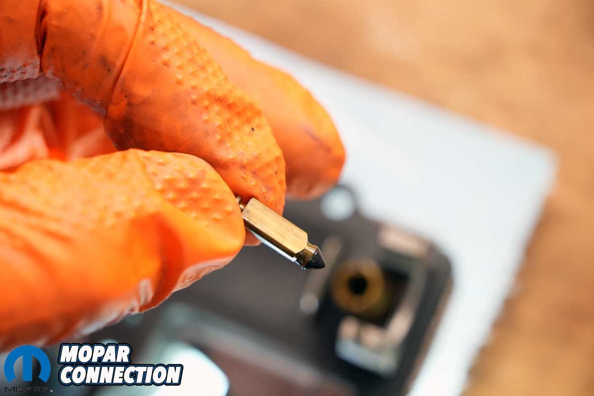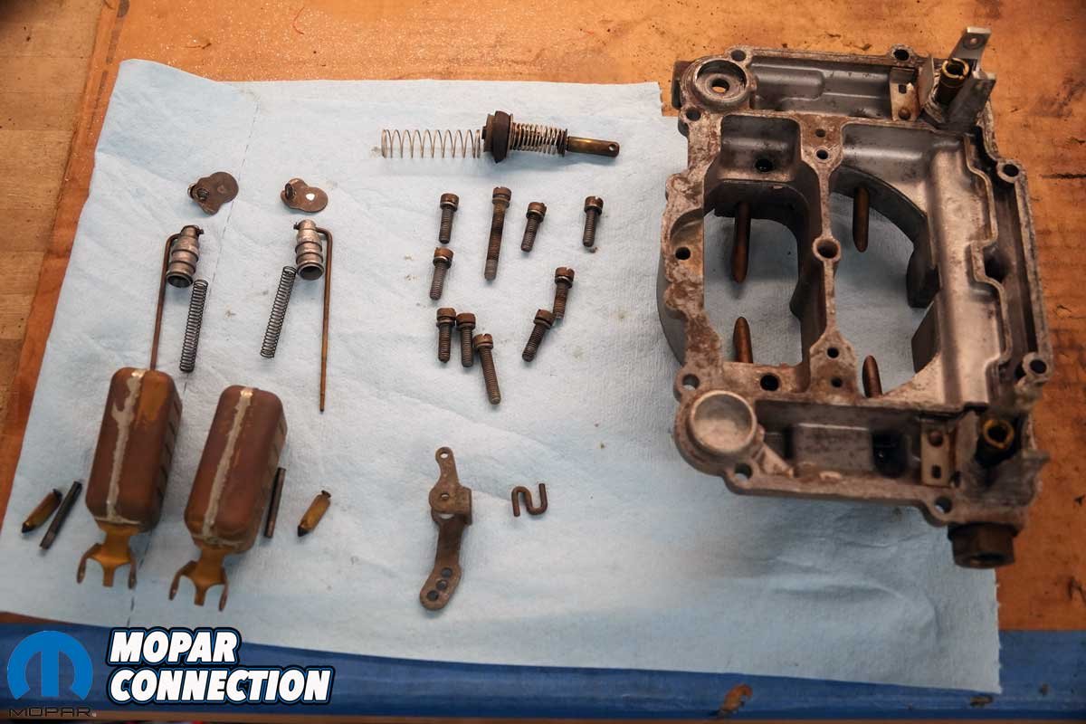 Above Left: We removed everything from the air horn except the seats for the needle and seat assemblies. They were removed after the photo. The metering rods had the correct dual-step diameters for a stock Hemi AFB. We cleaned everything and evaluated the floats for leaks by submerging them in water and looking for bubbles. Above Center: The main body was broken down, excluding the throttle shafts. We cleaned and blew out all the passages of the main body and the primary and secondary venturi clusters. Above Right: We sourced a fulcrum bolt for the accelerator pump lever arm from Allstate Carburetors.