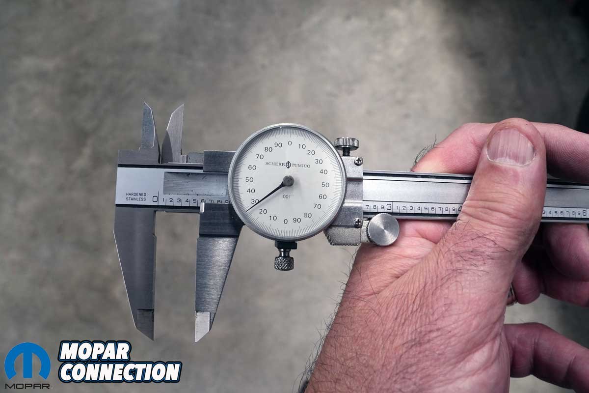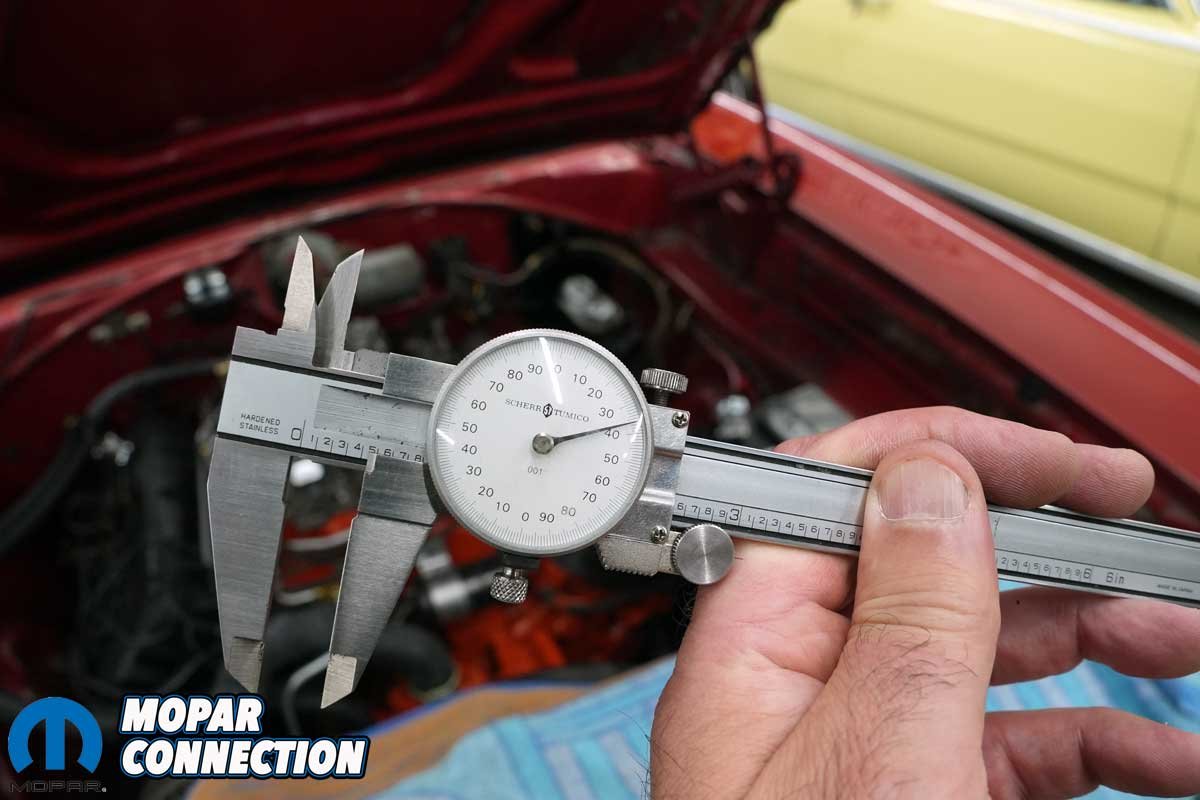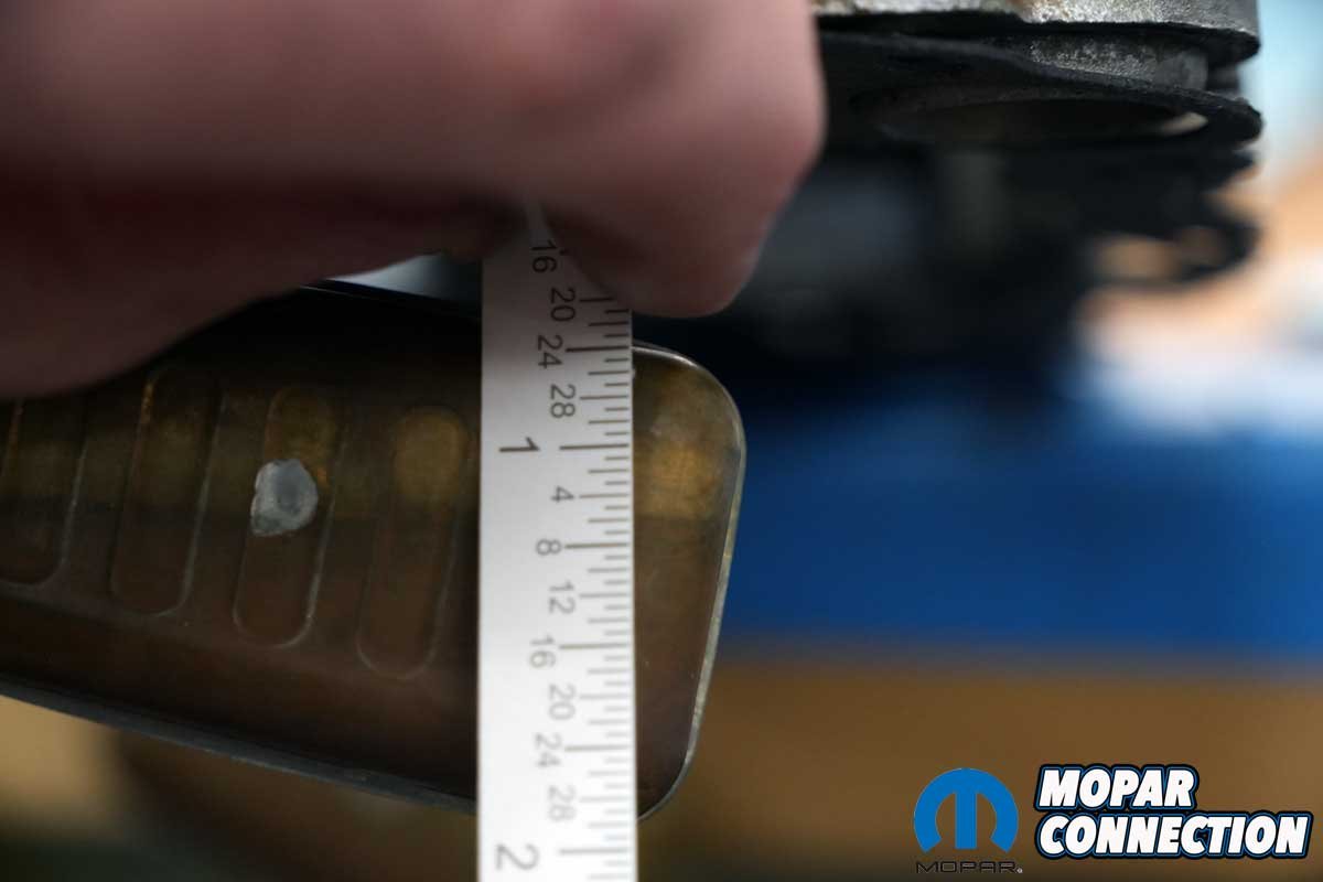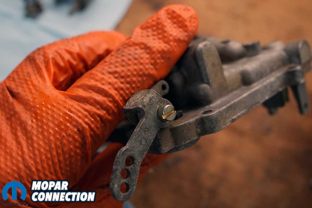 Above: After we moved the accelerator pump rod to hole “2” on the accelerator pump lever arm, we measured how far each accelerator pump stem extended above the air horn. The front accelerator pump stem measured 0.528 inches, and the rear carb’s stem measured 0.484 inches. The spec was 0.435-0.438 inches.