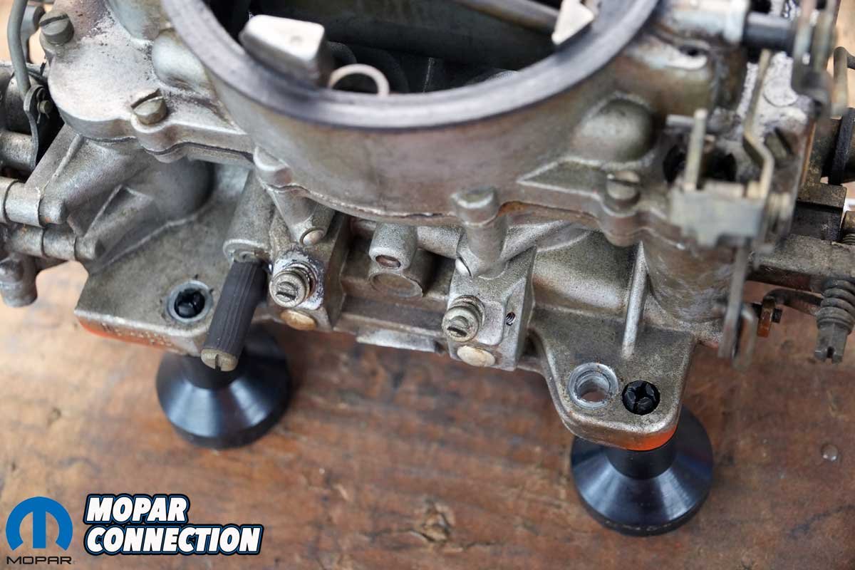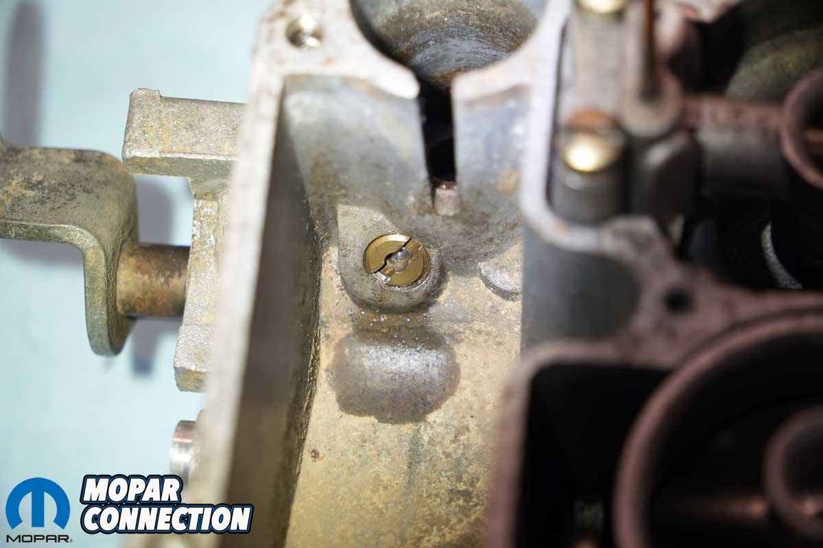 Above Left: The bowl vent had a rubber grommet that required service during our rebuild. Above Right: The idle mixture screws were seized in place, but with some lubricant and patience, we finally got them unthreaded. The vacuum advance port was plugged. After investigation, we found the distributor’s vacuum advance diaphragm was damaged and would not hold the vacuum. So, until we replace the vacuum advance unit, we will continue with the plugged vacuum port. However, we will install a real vacuum plug.