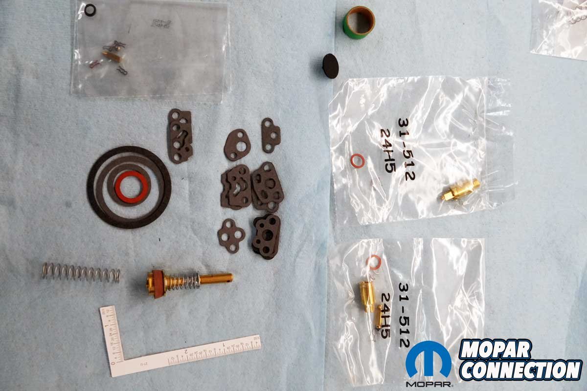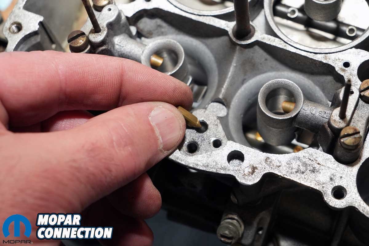 For the rebuilding parts, we selected MikesCarb.com part number K618. The kit (we needed two) comes with gaskets, needles and seats, springs, the accelerator pump assembly, and a leather gasket. Starting with the front carburetor, we reinstalled all four jets and the accelerator pump inlet check valve.