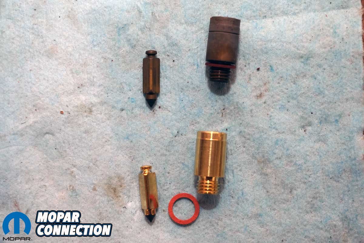 Above Left: We picked up two carb rebuild kits from MikesCarb.com. The kits had everything we needed to rebuild the AFBs. Above Center: The stem and plunger come assembled, but the spring and clip had to be installed before use. Above Right: At the top was one of the two needle and seat assemblies from the front carburetor’s air horn. The lower is a new needle and seat with the gasket not yet installed.