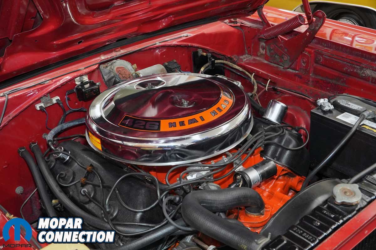 Above Left: The Carter AFBs are cleaner than when we got them, but more importantly, they are assembled correctly and operate much better. Before we fine-tune them, we need to fix the fuel supply system. Nestled in the old plug wires is a Holley fuel regulator, and at the fuel tank, there is an extremely noisy electric Holley fuel pump. All of that will be going away with the help of Year One and a bunch of its quality fuel system parts. Above Right: It is almost a shame to cover up all our work, but installing a 57-year-old chrome dome air cleaner with a 426 Hemi Head banner makes up for it.