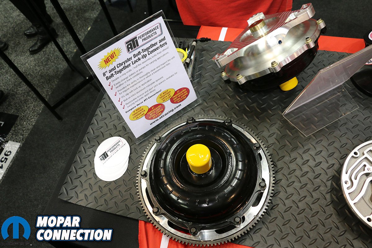 Top: BMR Suspension’s booth showing off their new LX suspension. Bottom Left: CVF’s big block Chrysler Wraptor kit on display. Bottom Right: ATI Transmissions new Bolt-Together 8″ torque converter for 727 transmissions.