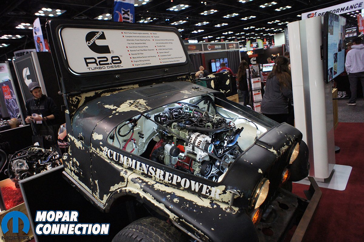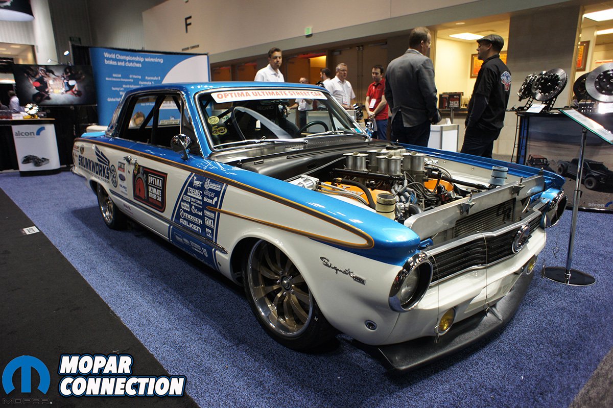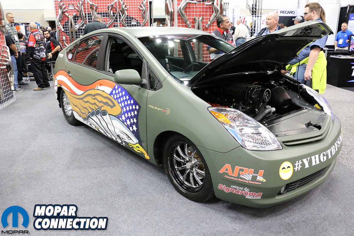 The last part of the PRI Show and sometimes the most exciting is the cars. Although you will find many other makes, there were a few Mopars scattered throughout the show. The most interesting was the Challenger sitting on its side at the BMR Suspension booth. It constantly had a crowd around it. There was half a Jeep at the Cummins booth showing off the new R2.8 Turbo Diesel Cummins crate motor. Although it’s only half Mopar, there was a Prius with a supercharged Gen III HEMI crammed under the hood. One of our favorites was the Skunkworks 1964 “Violent Valiant” parked at the Alcon booth.