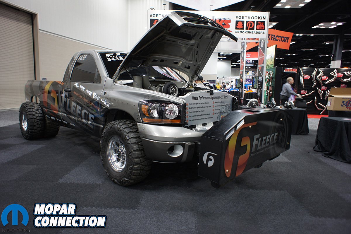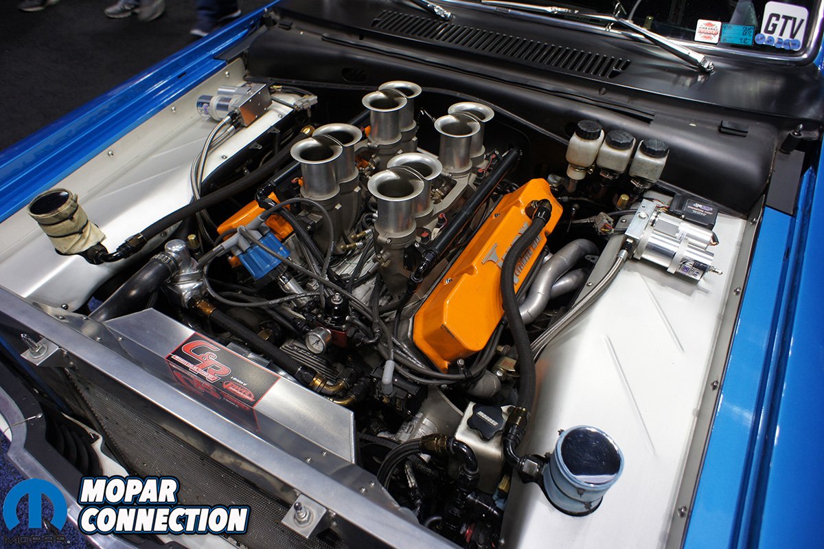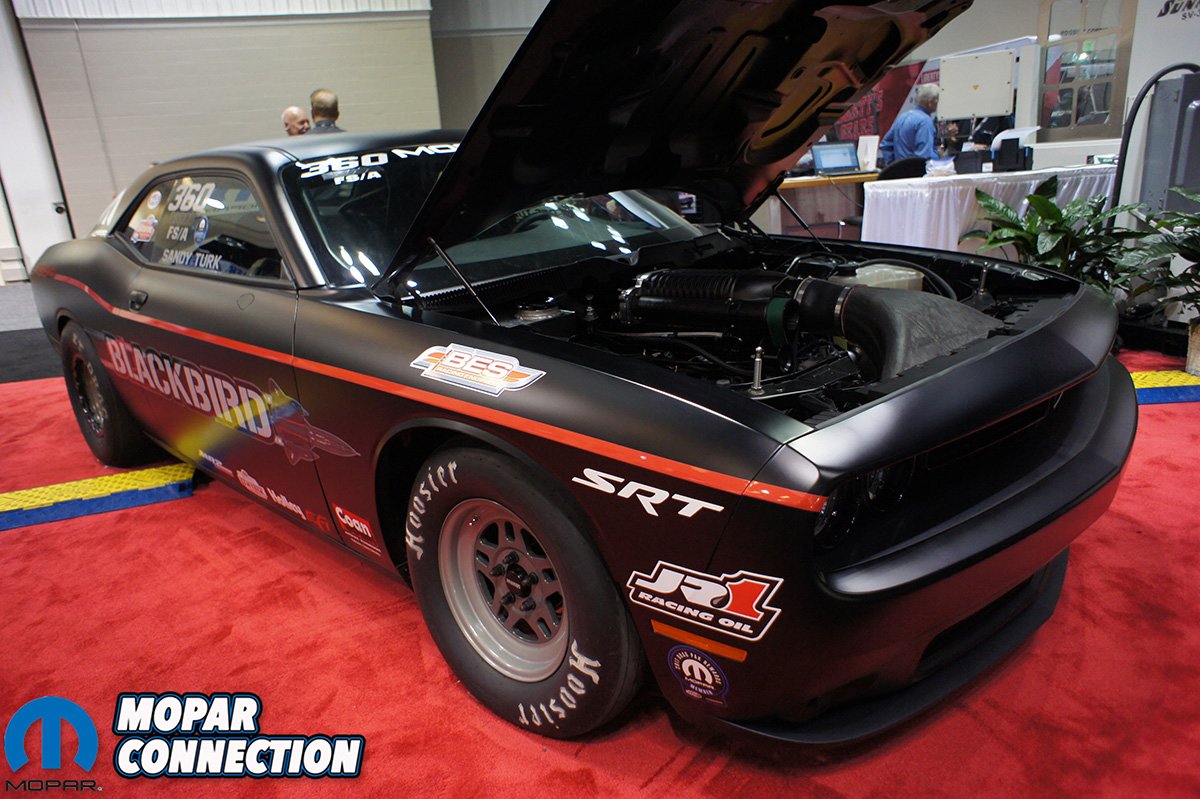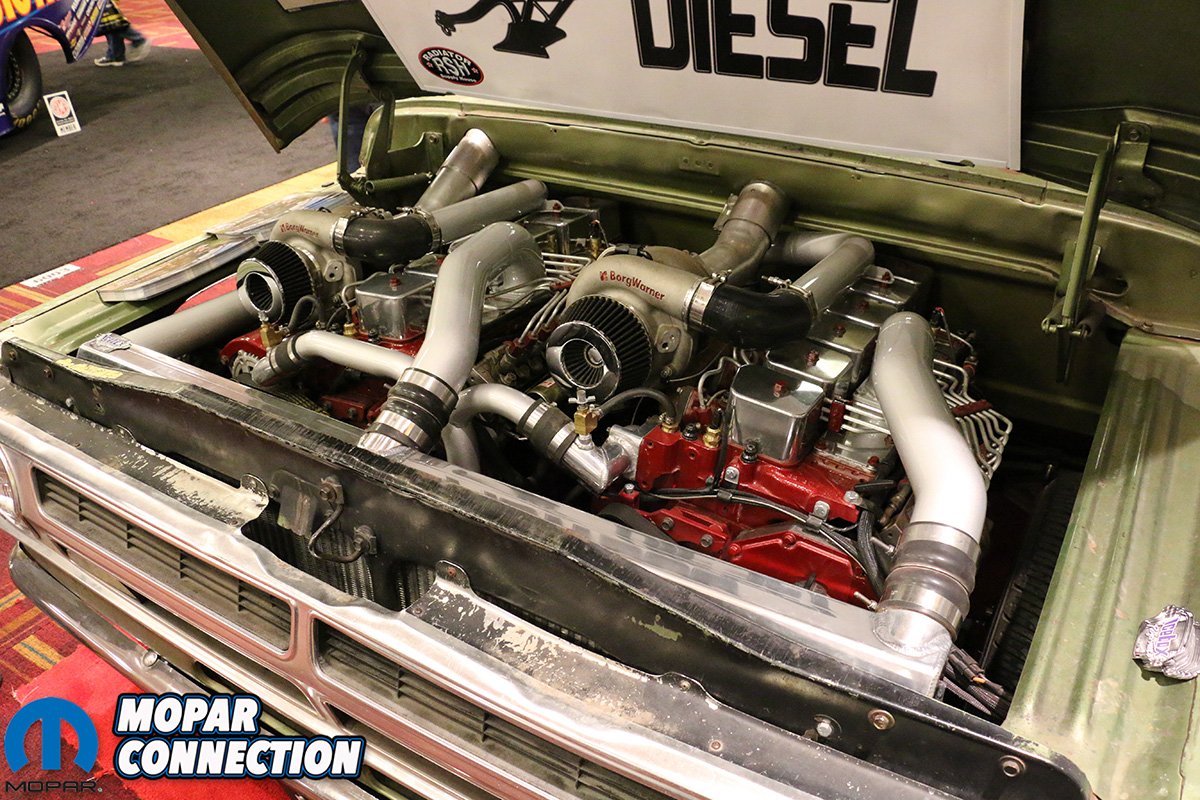The last part of the PRI Show and sometimes the most exciting is the cars. Although you will find many other makes, there were a few Mopars scattered throughout the show. The most interesting was the Challenger sitting on its side at the BMR Suspension booth. It constantly had a crowd around it. There was half a Jeep at the Cummins booth showing off the new R2.8 Turbo Diesel Cummins crate motor. Although it’s only half Mopar, there was a Prius with a supercharged Gen III HEMI crammed under the hood. One of our favorites was the Skunkworks 1964 “Violent Valiant” parked at the Alcon booth.
