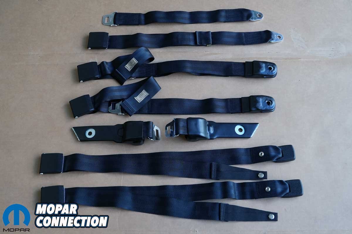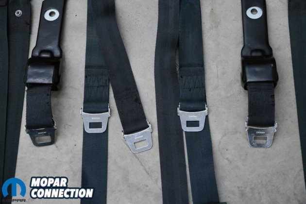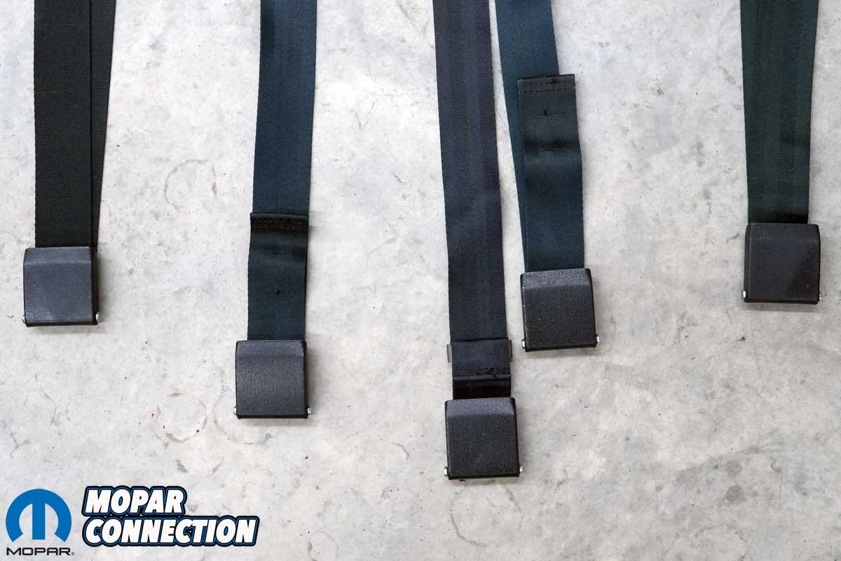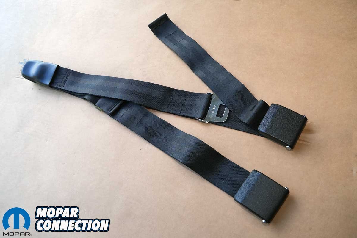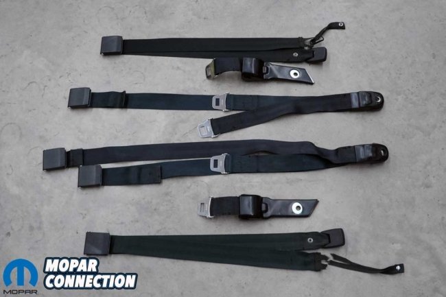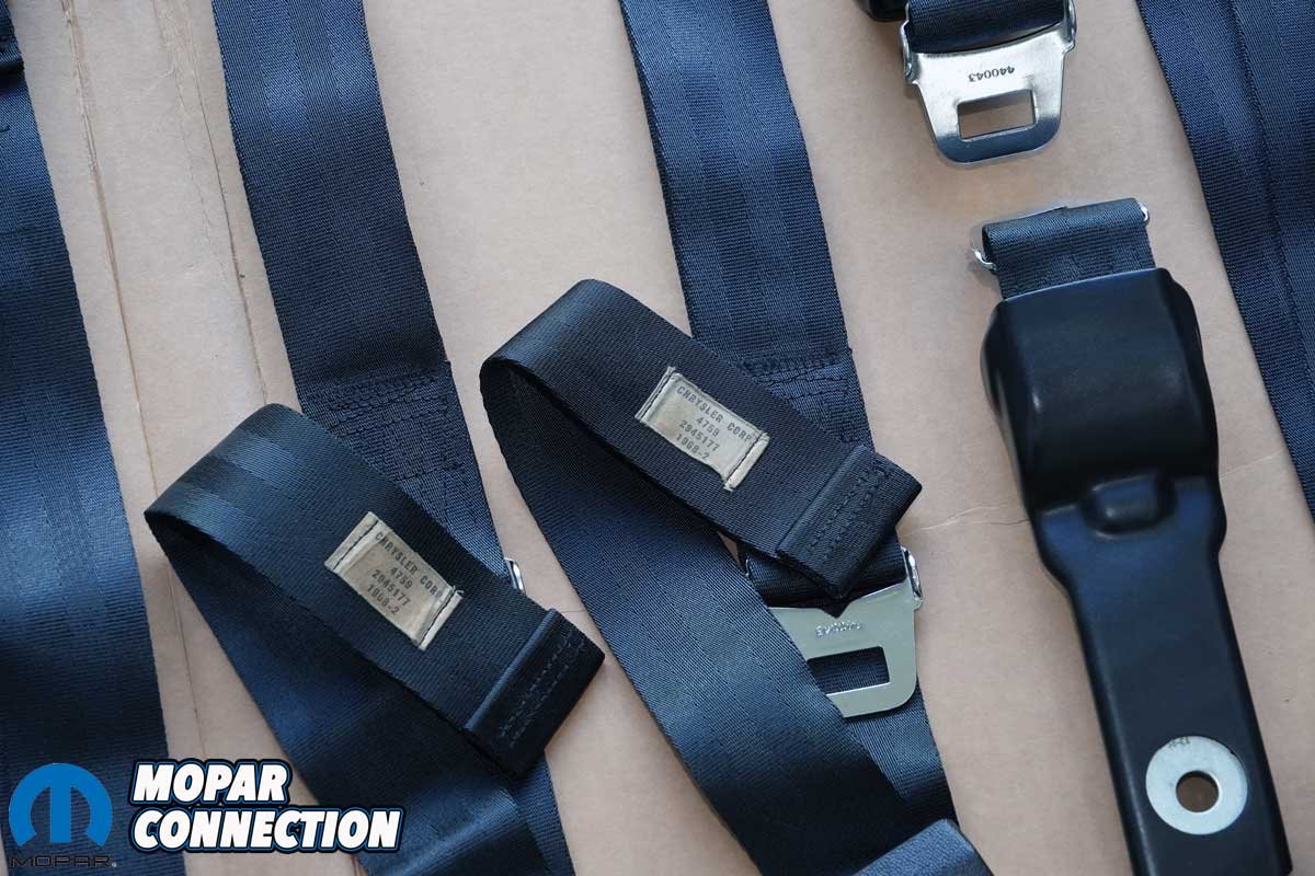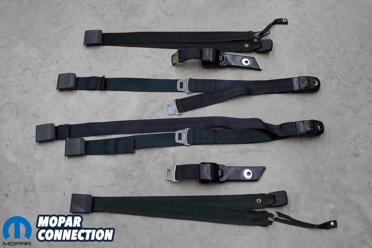 Depending on the model year of your Mopar, you may find it equipped with no belts at all, simple front outboard lap belts, the addition of rear outboard lap belts, or, on later vehicles, a combination of lap and sash belts or full three-point restraints up front paired with lap belts in the rear.