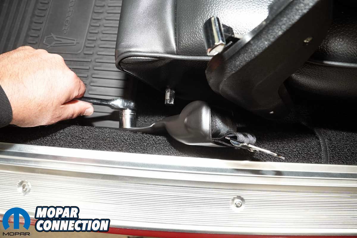 Above Left: We installed the driver’s side ratchet assembly with the factory anchor bolt. Above Right: The passenger’s side assembly was bolted in place with the factory bolt. The ratchet housings are a bit bulky, but they clear every component in their vicinity.