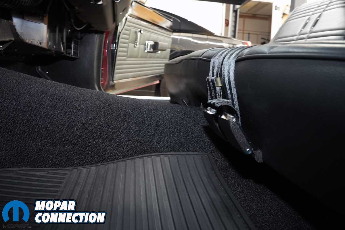 Above Left: The driver’s side center belts consisted of a belt with a buckle and latch for the driver and a second belt and buckle for the center seat occupant. Above Right: Both belts were secured to the floor with the factory bolt. The rubber cover hides the bolt and belt ends from view. Sharon’s Web recolored the cover.